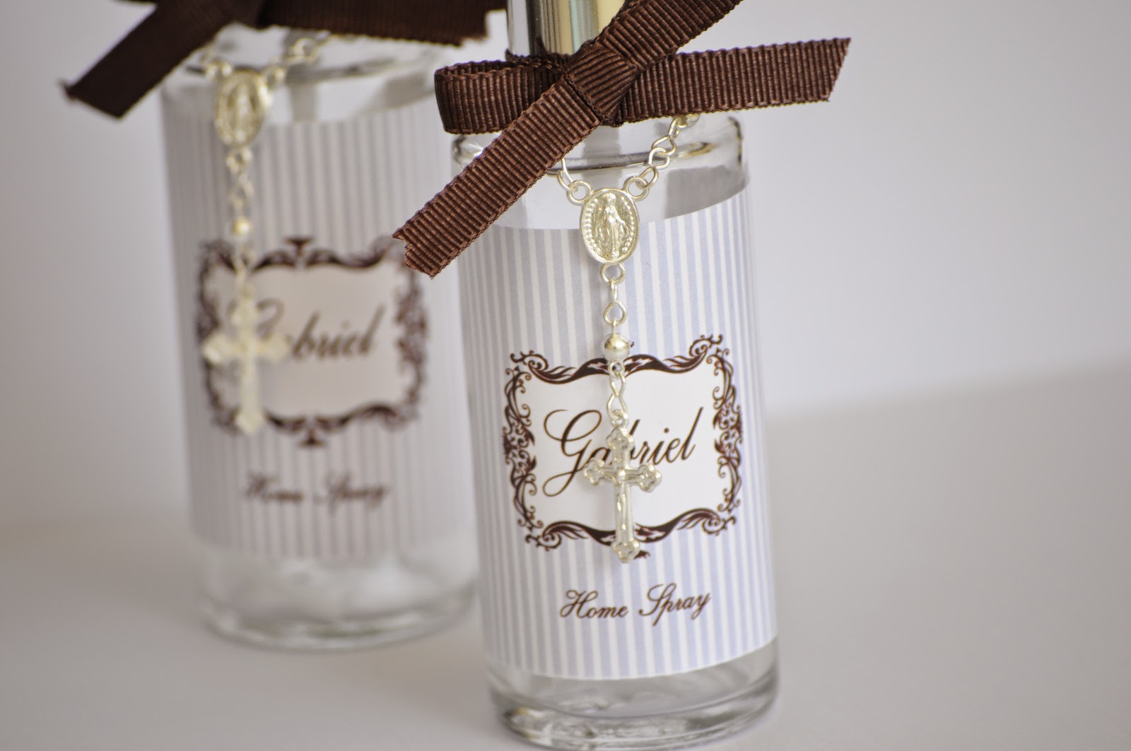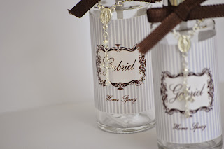 Como lembrancinha a mamãe optou por um home spray que foi acompanhado por um mini terço prata.