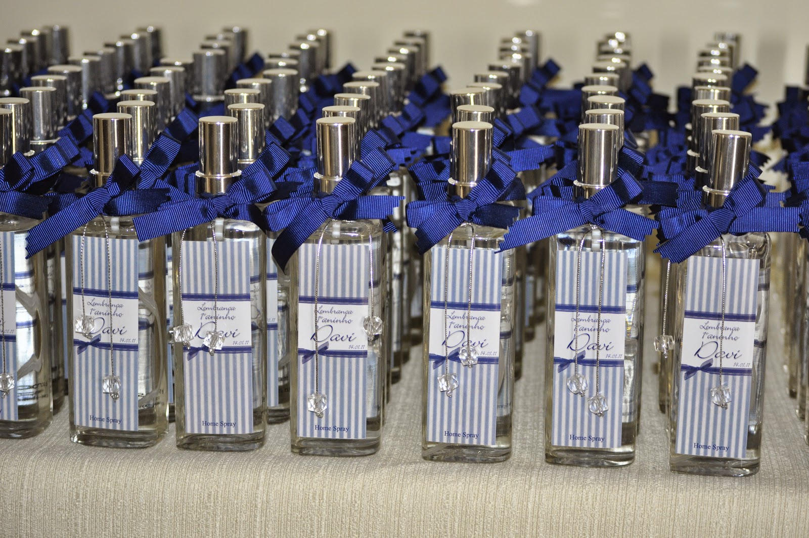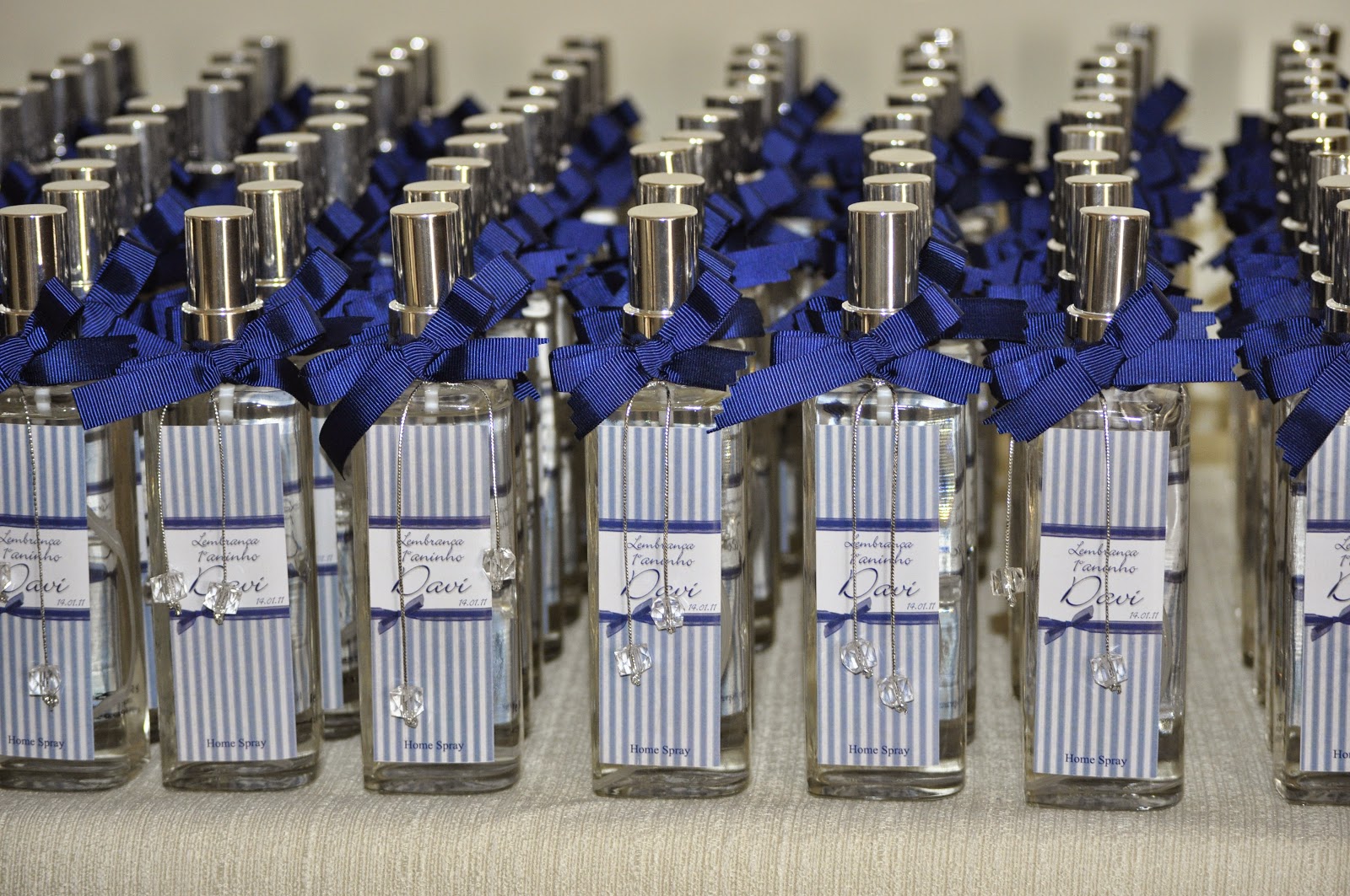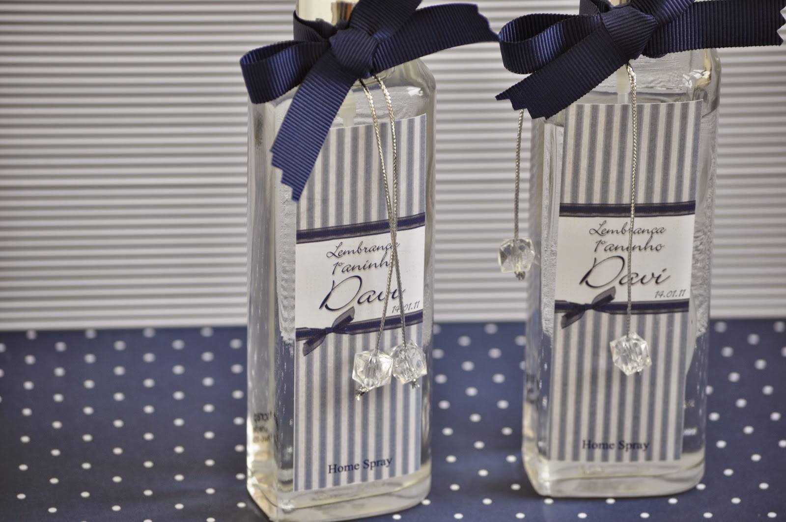 Para comemorar o primeiro ano de vida do Davi a mamãe encomendou estes lindo home spray que foi confeccionado nos tons de azul marinho e branco.