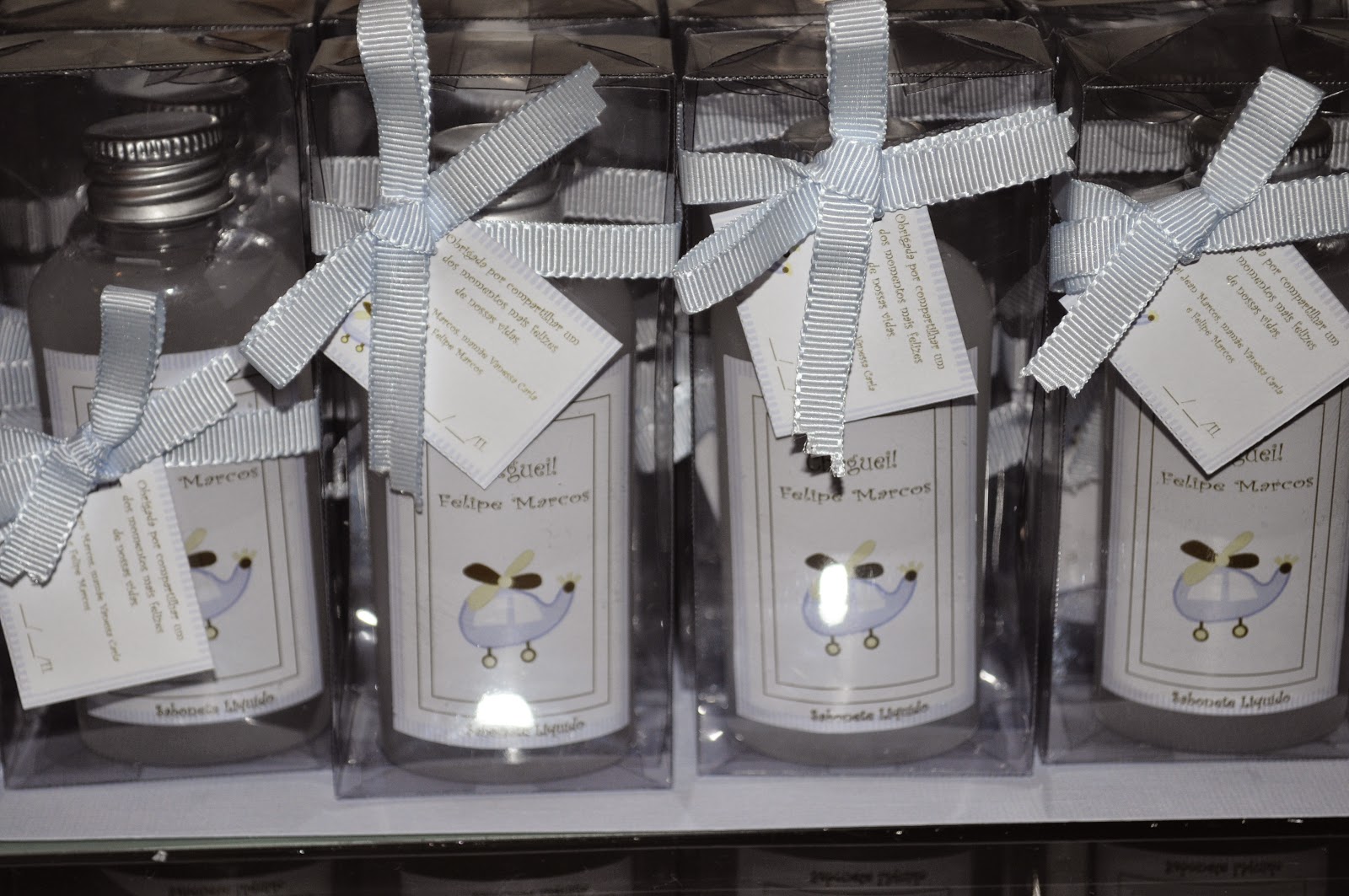 Entre varias opções a mamãe optou por um frasquinho de sabonete liquido que teve o seu rotulo personalizado.