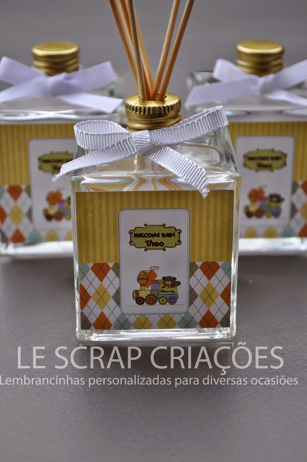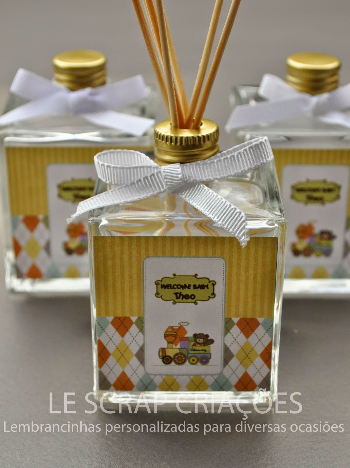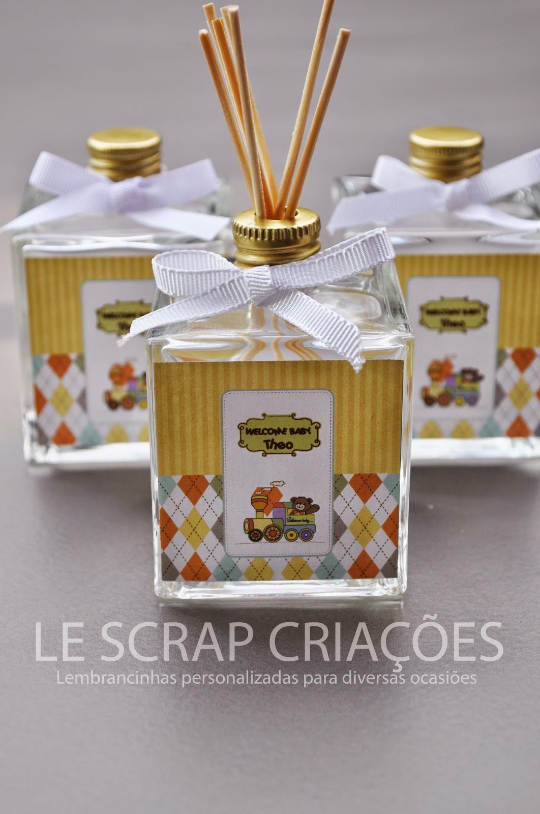 Esta foi a lembrancinha confeccionada para a chegada do Theo. Mini difusor de ambiente modelo quartier de 100ml.