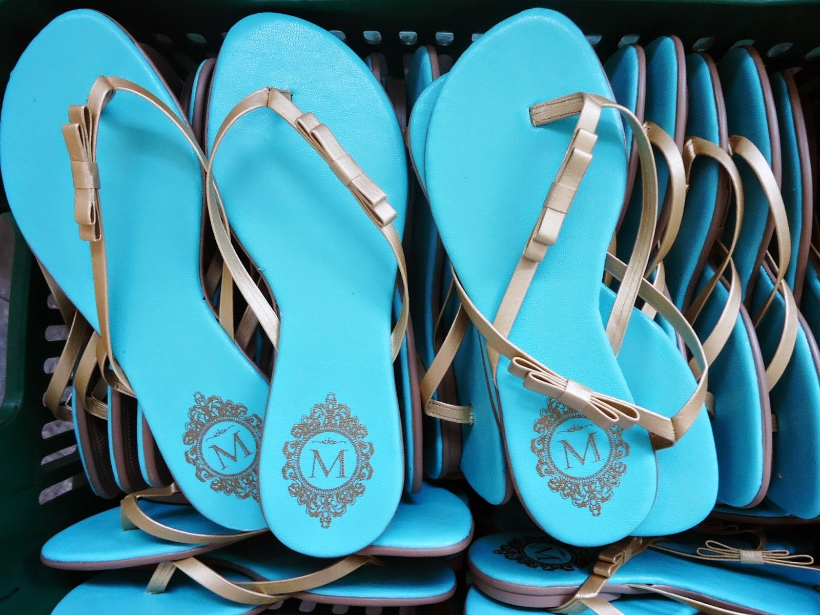 Rasteirinhas na cor azul Tiffany com laço Chanel dourado e personalizada com baixo relevo.