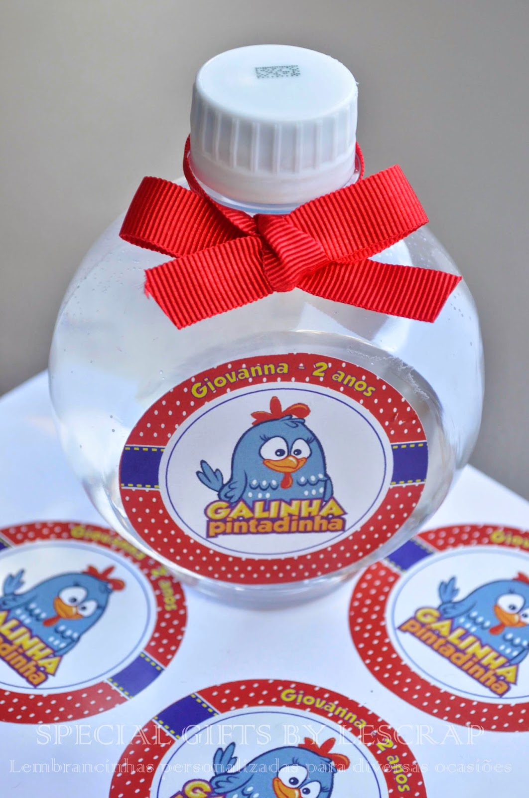 Para o aniversário da Giovanna a mamãe encomendou rótulos adesivos com o tema Galinha Pintadinha para fazer parte da decoracao.