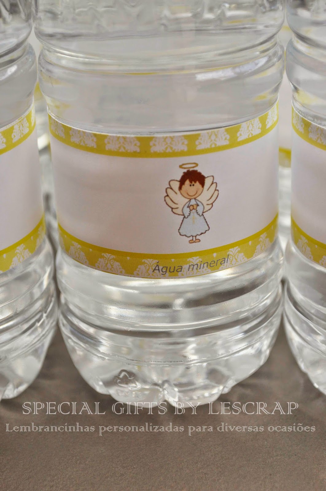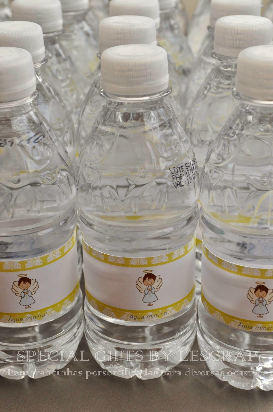 A mamãe muito caprichosa solicitou que fosse conficionado algumas garrafinhas de agua mineral para compor a decoracao do batizado.