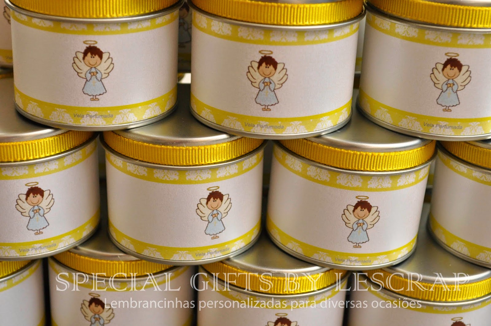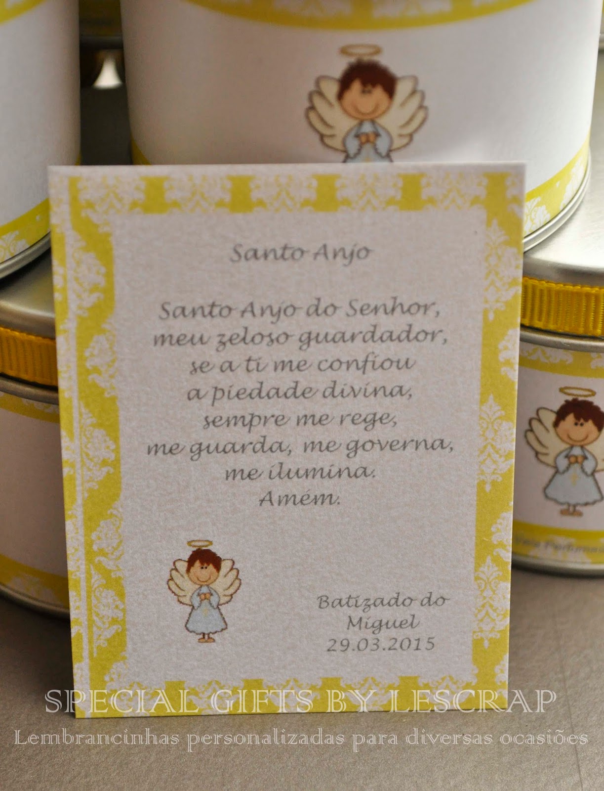 A mamãe muito caprichosa solicitou que fosse conficionado para presentear os convidados uma latinha com vela perfumada acompanhada da oracao do Santo Anjo.