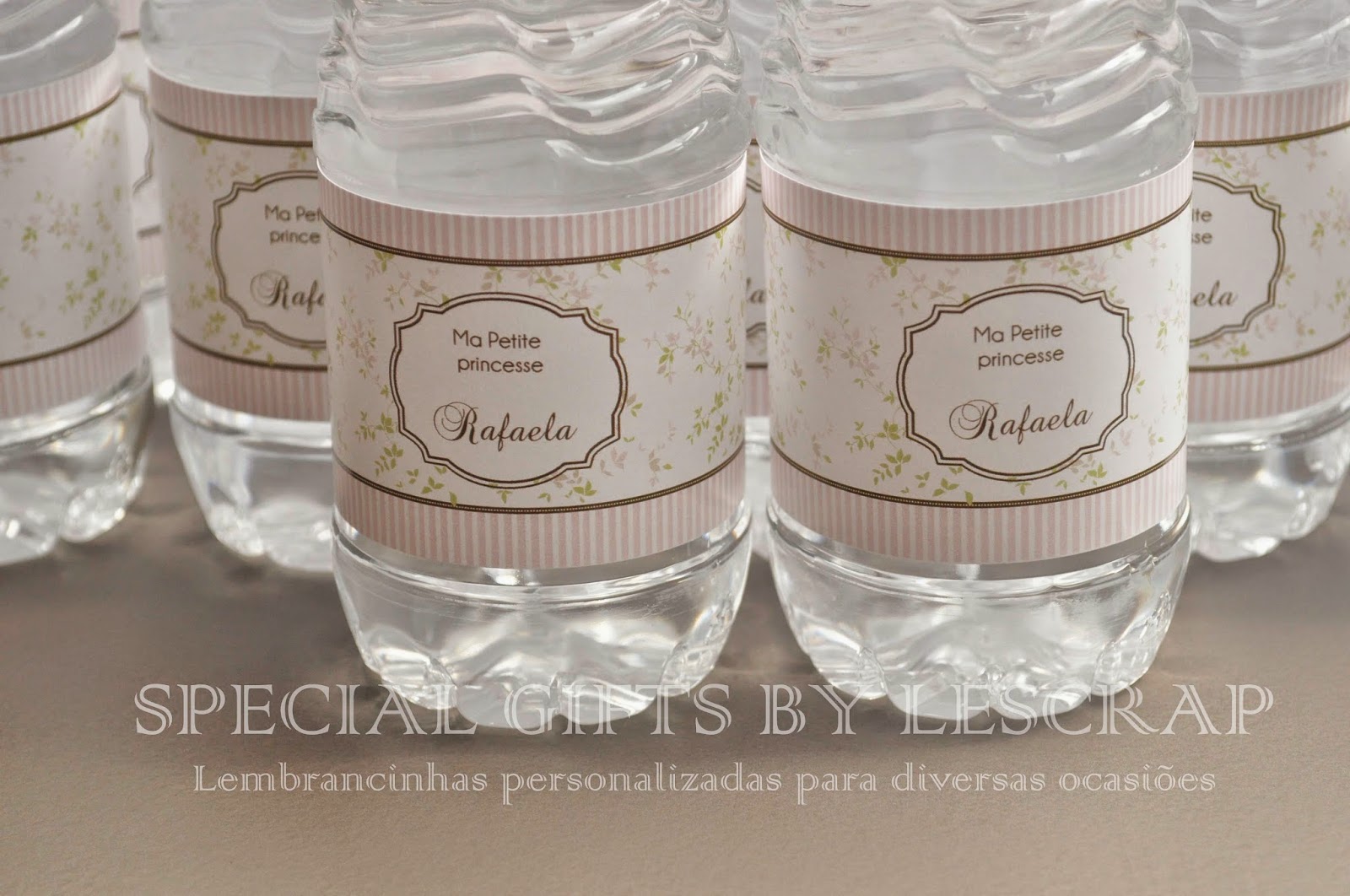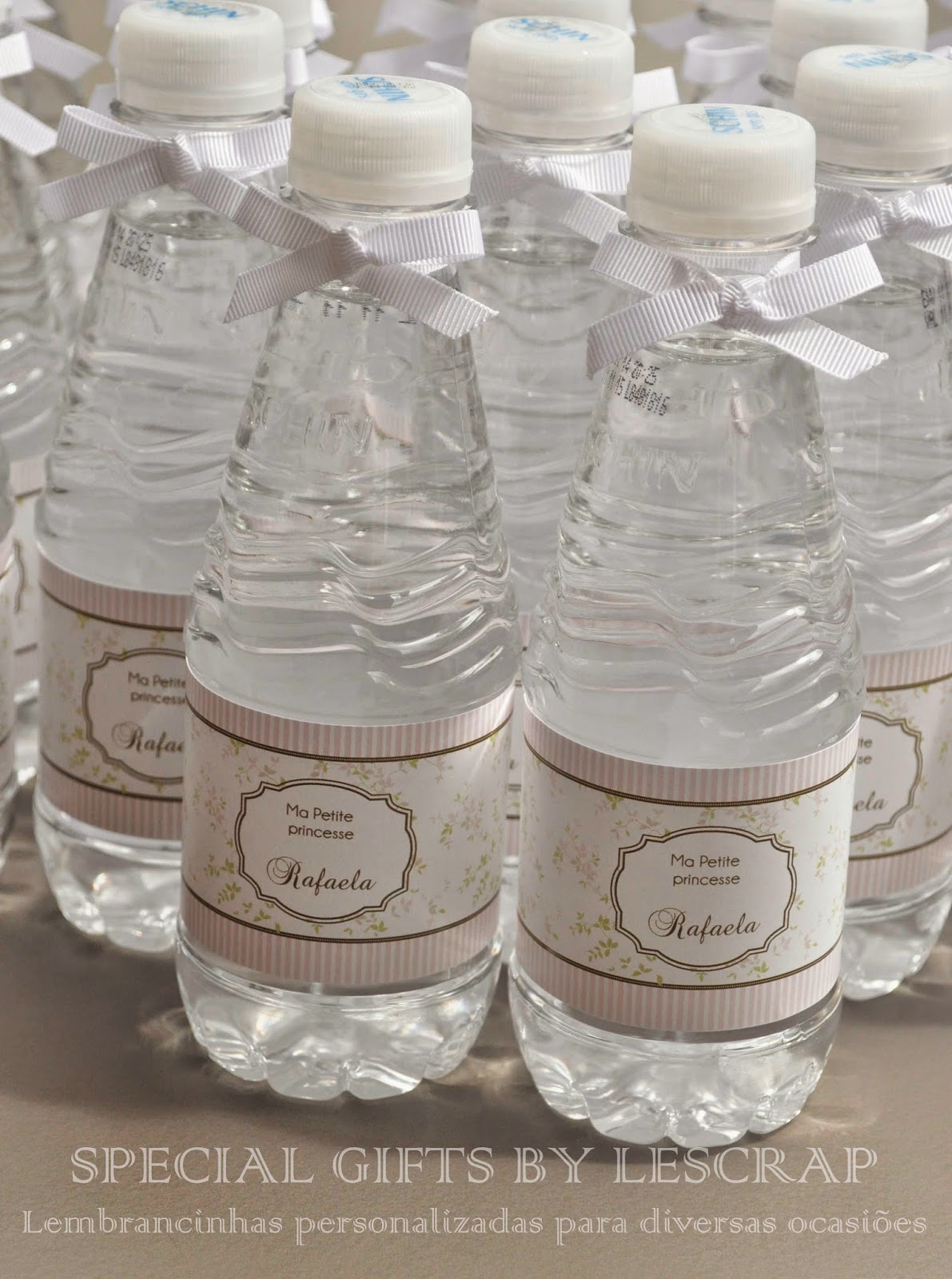 Para a chegada da Rafaela confeccionamos também garrafinhas de agua mineral de 300 ml com rotulo personalizado e fita de gorgurao.