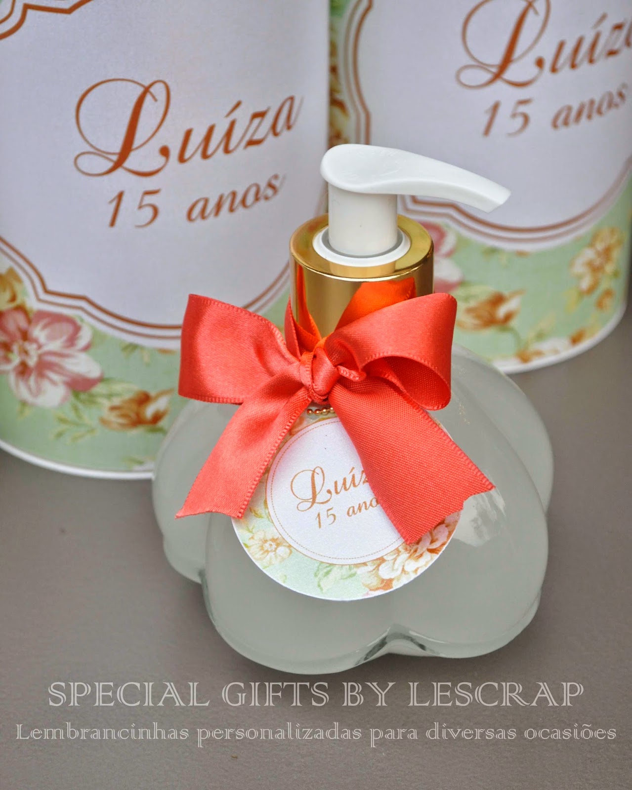 Como lembrancinha a mamãe escolheu um frasco de sabonete liquido de acompanhado de uma linda embalagem personalizada.