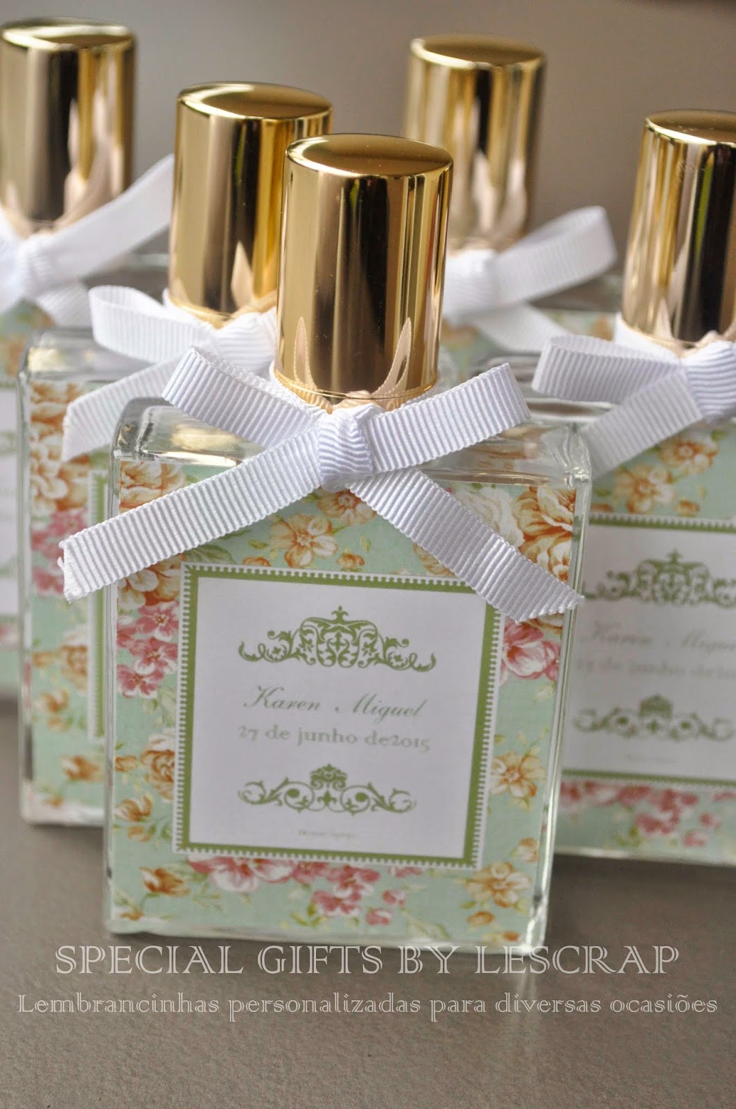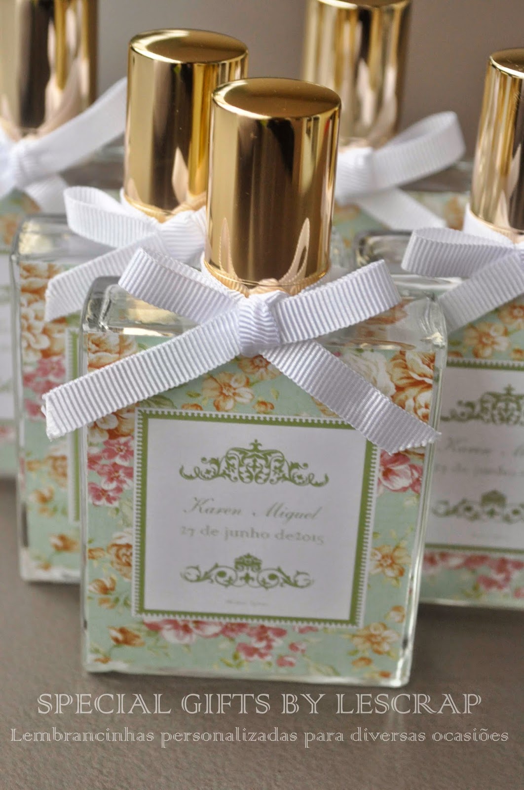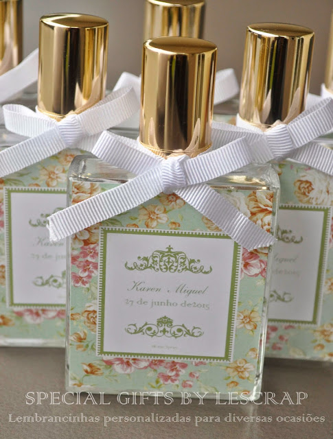 Os noivos escolheram um frasco de home spray modelo Chanel de 50 ml com essencia Cha Branco.