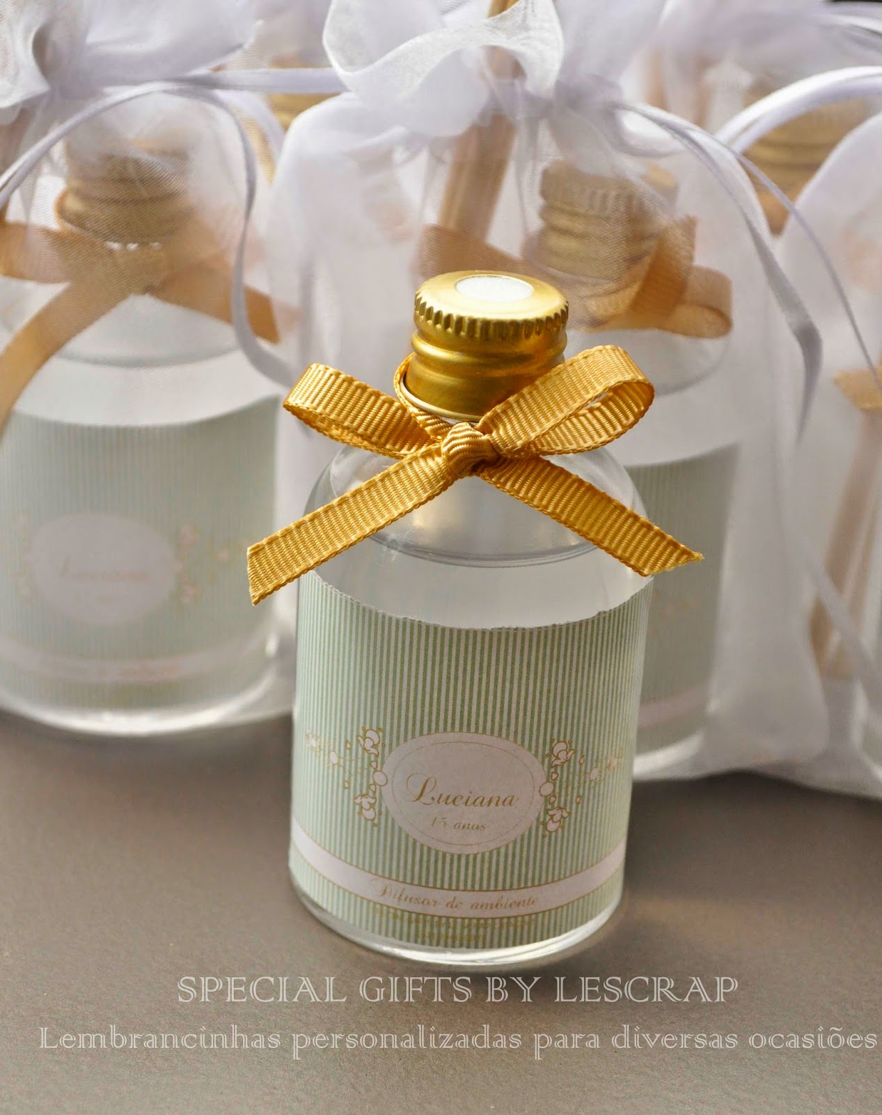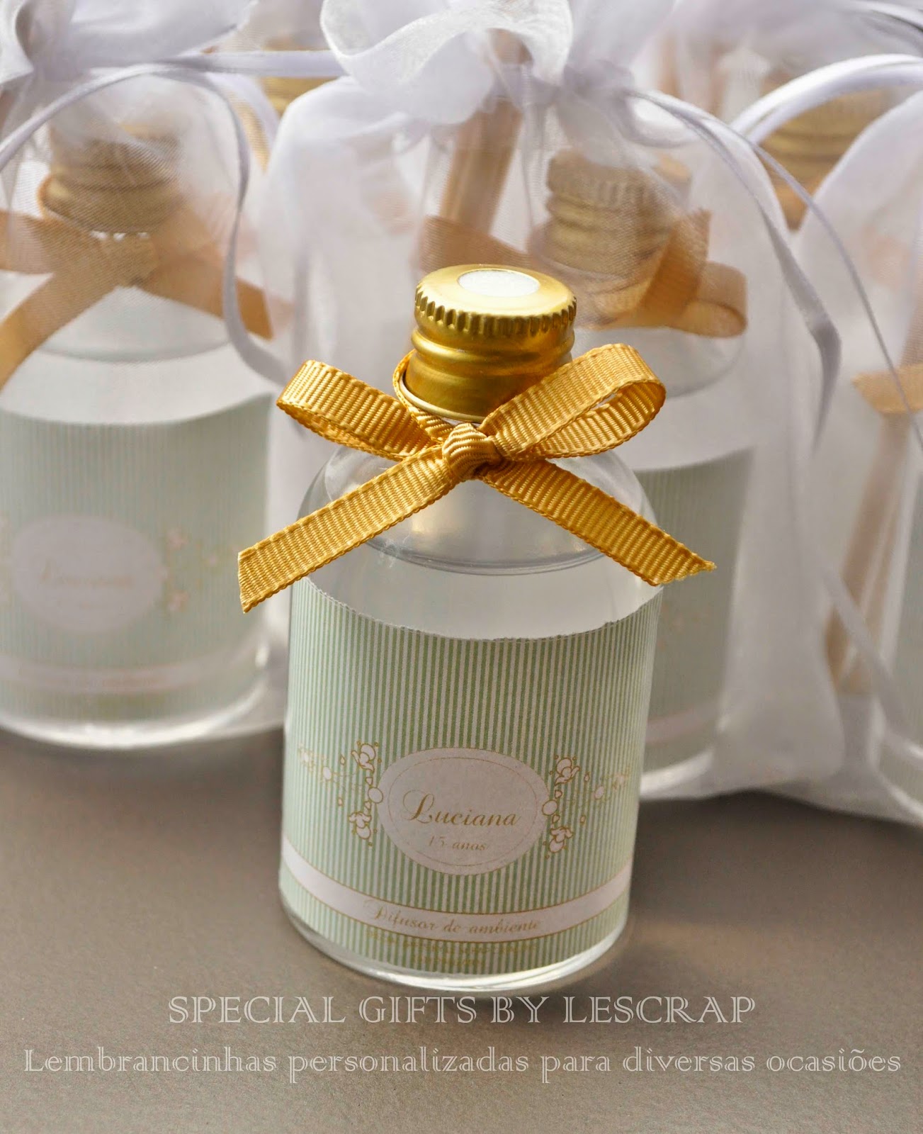 Para o aniversario de 15 anos da Luciana confeccionamos mini difusores de ambiente de 60 ml modelo conico para ser entregue aos convidados.