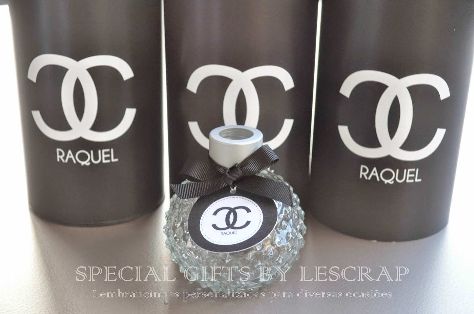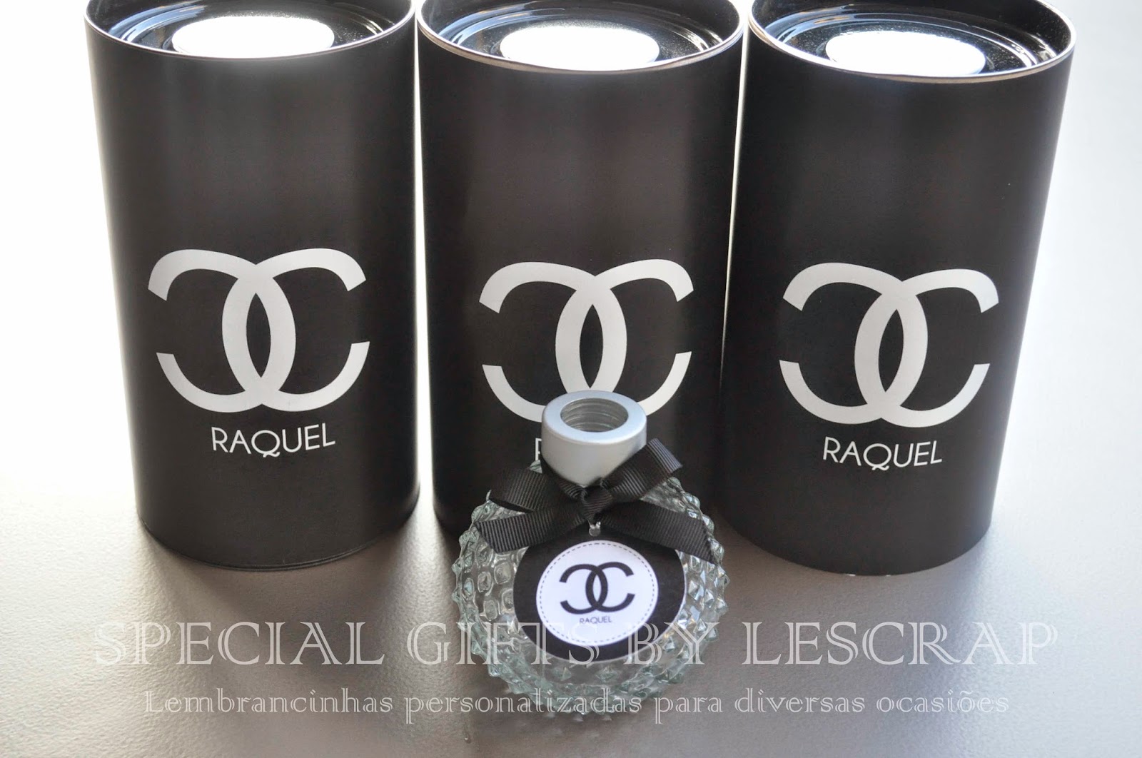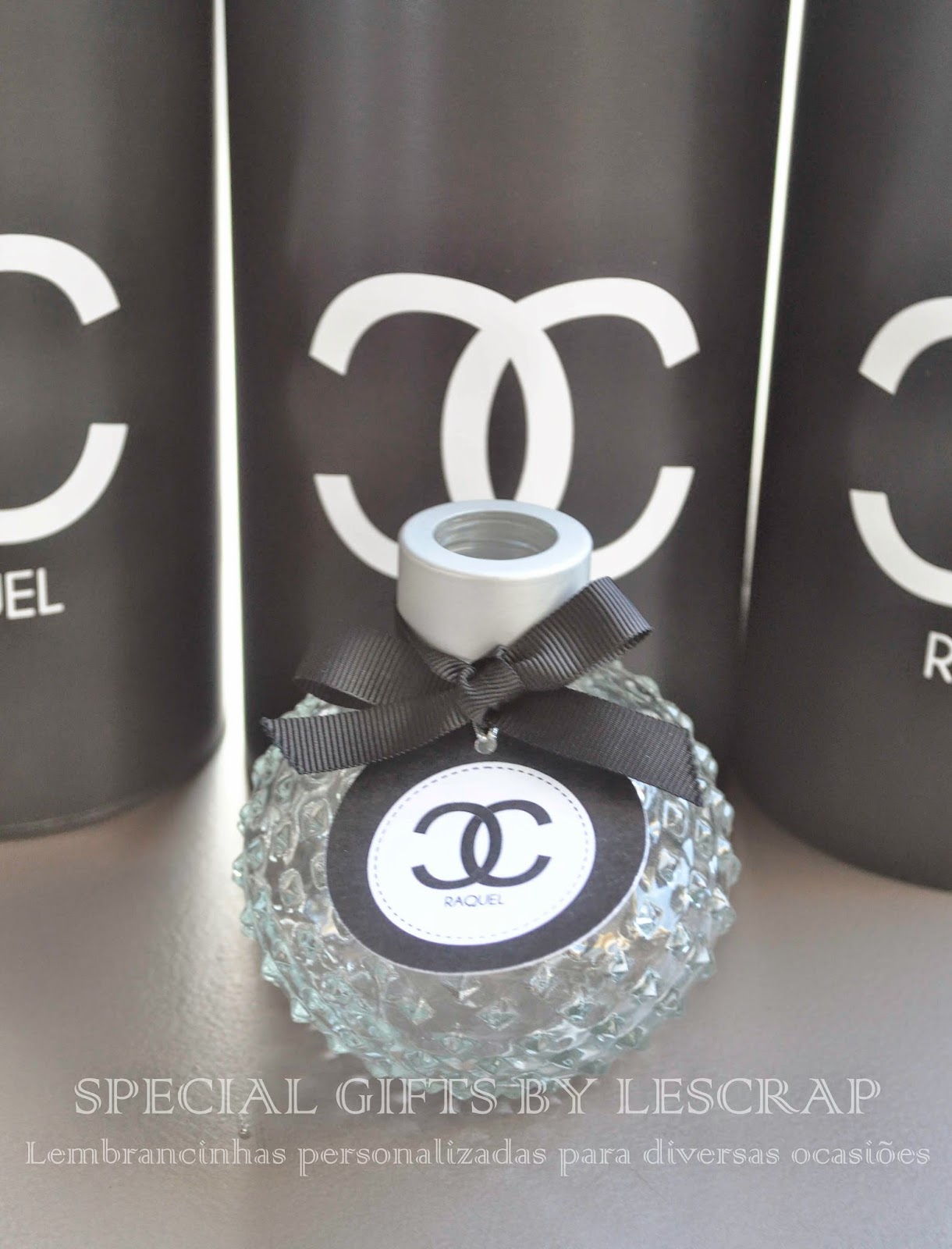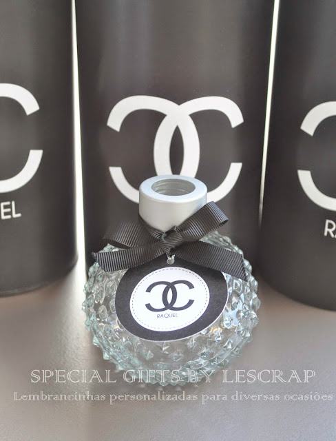 Como lembrancinha confeccinamos um frasco de difusor de ambiente modelo retro balle de 150 ml com rotulo personalizado com o tema chanel.