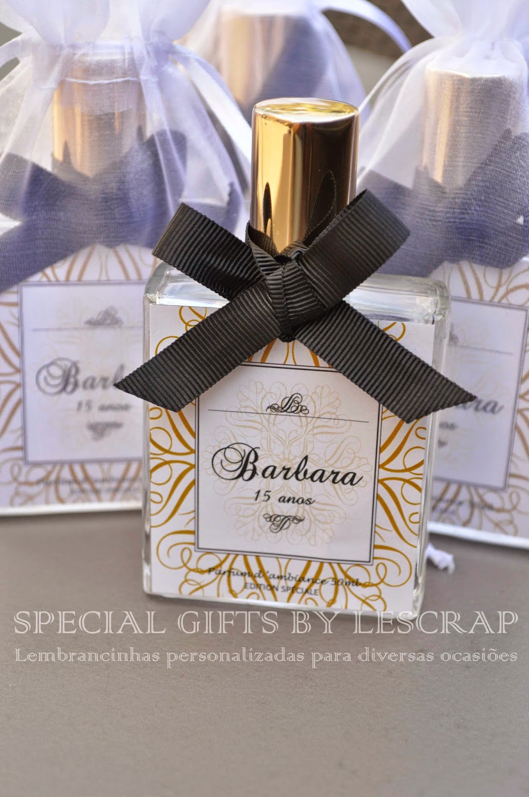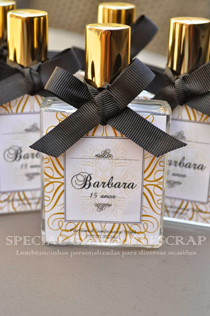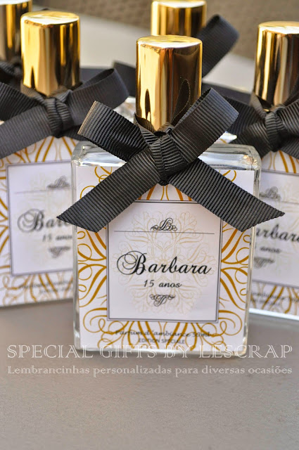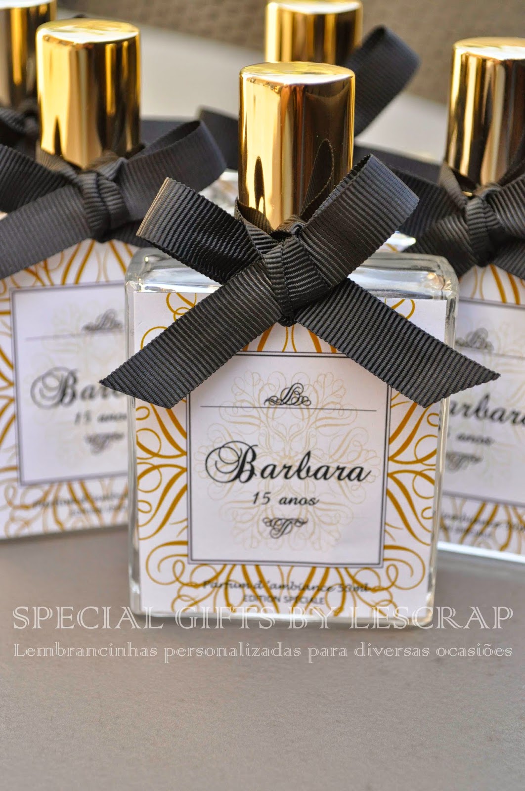 Como lembrancinha confeccionamos um frasco de home spray modelo chanel de 50 ml. usando as cores branco,dourado e preto.
