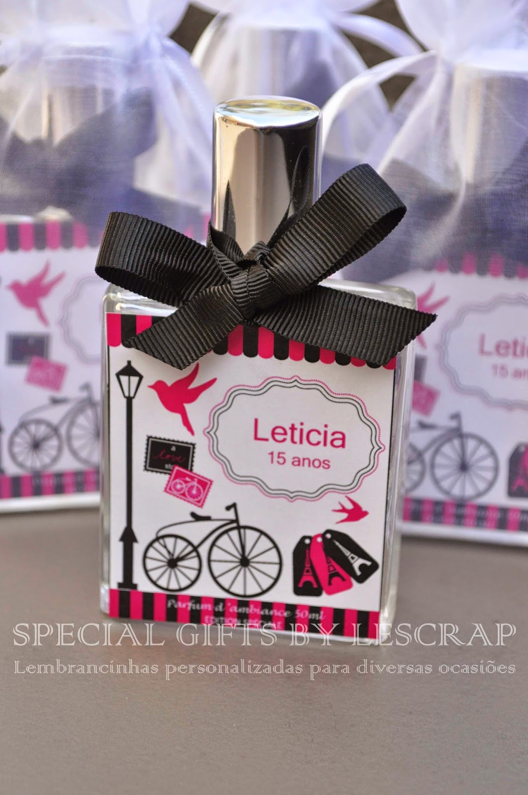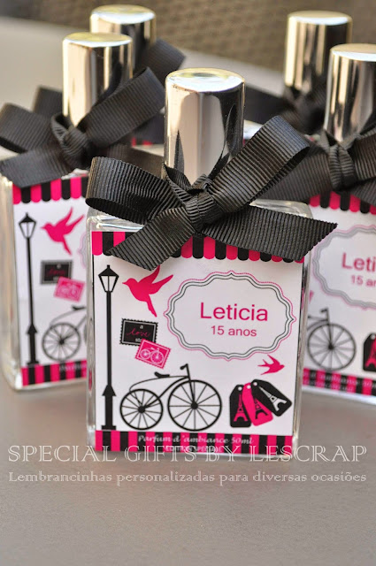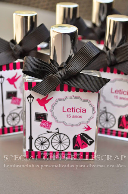 Como lembrancinha preparamos um frasco de home spray modelo chanel de 50 ml com o tema Paris.