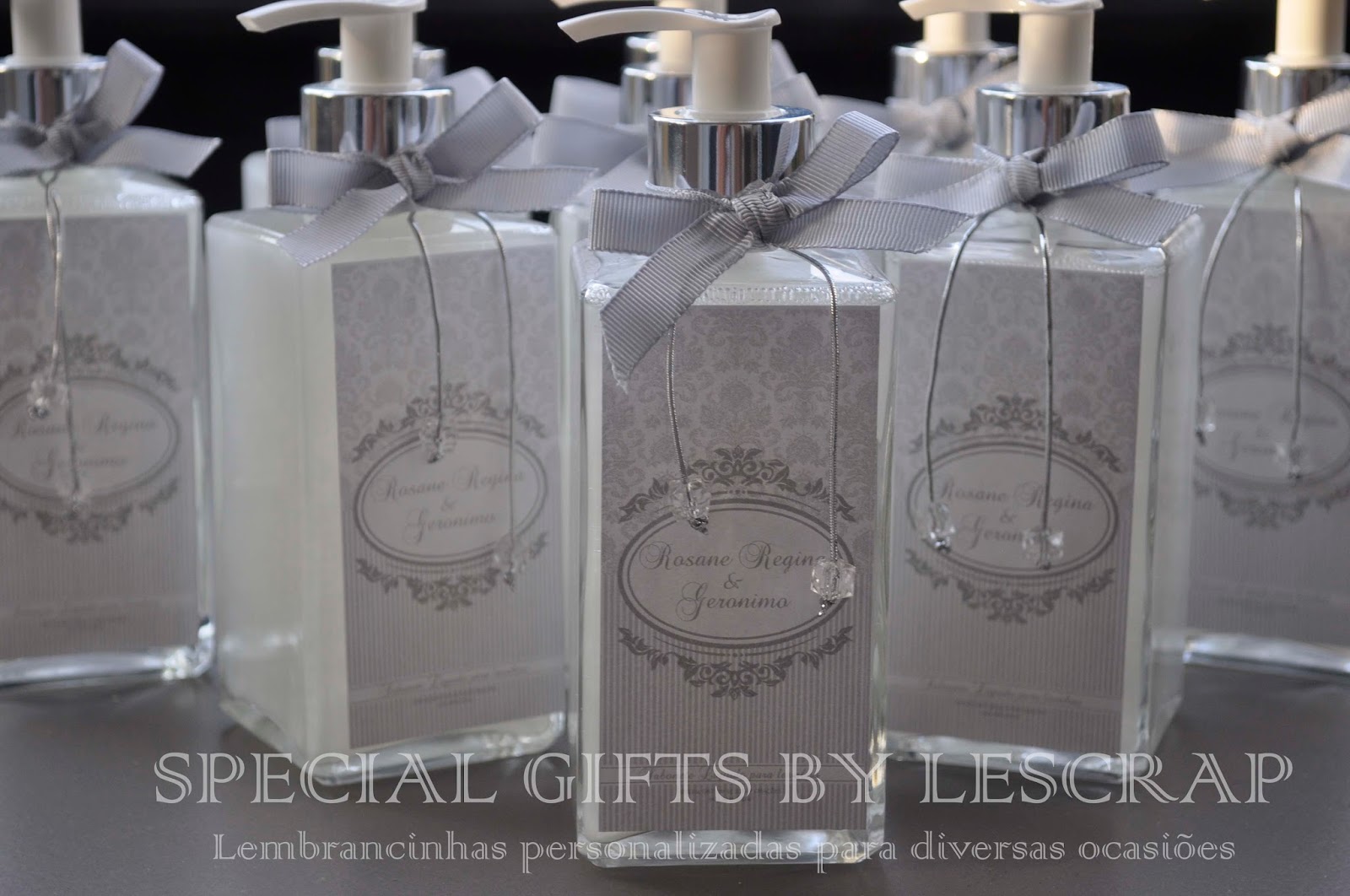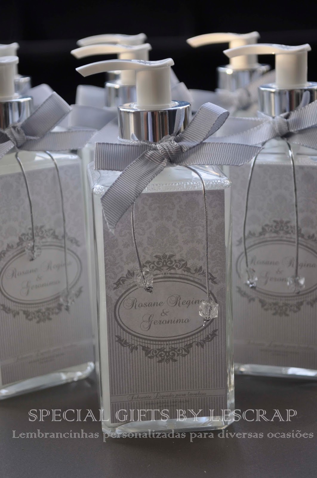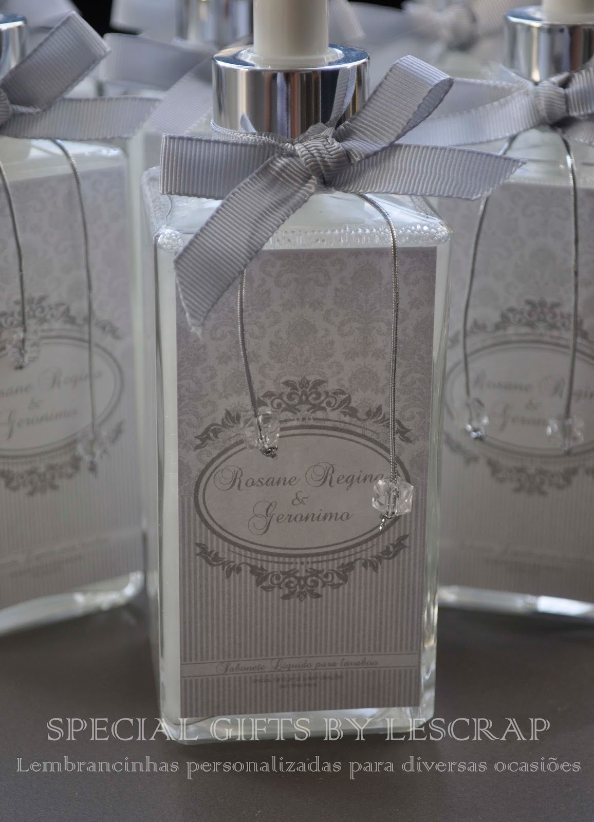 Frasco de sabonete liquido modelo quartier de 250 ml, rótulo personalizado e fita de gorgurão acompanha confeccionado para presentear e relembrar os 25 anos de casados do casal Rosane e Geronimo.