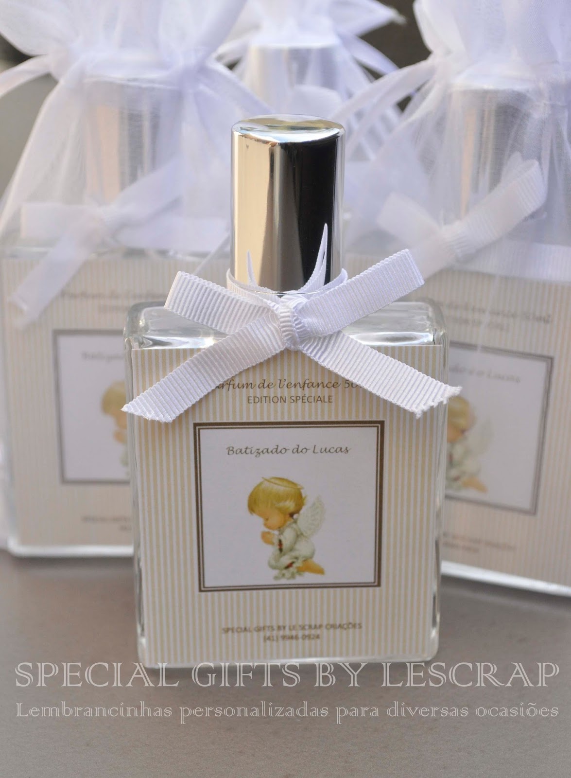 Frasco de home spray modelo chanel de 50 ml, rótulo personalizado, fita de gorgurão, embalagem de organza confeccionado para o batizado do Lucas.