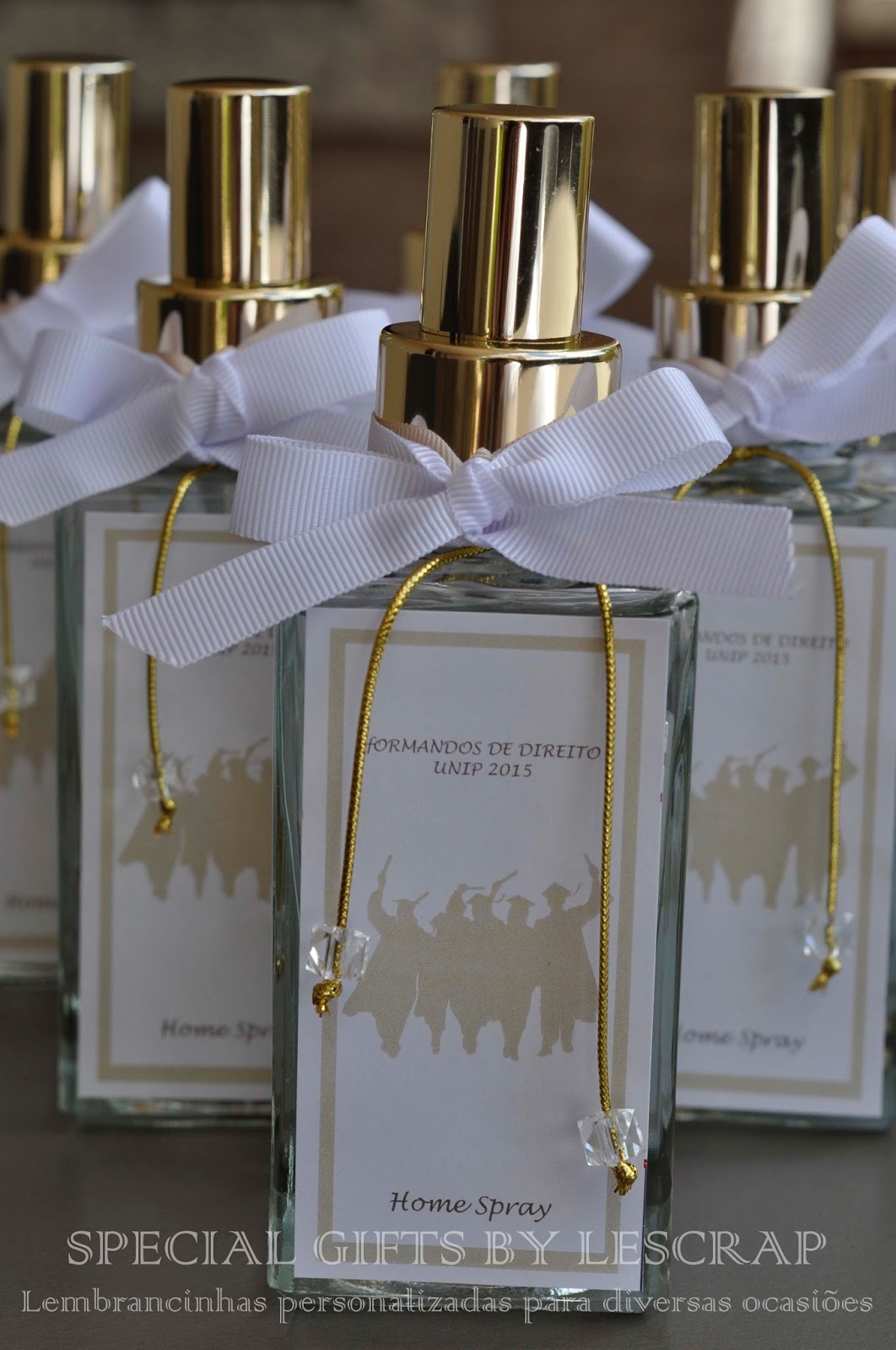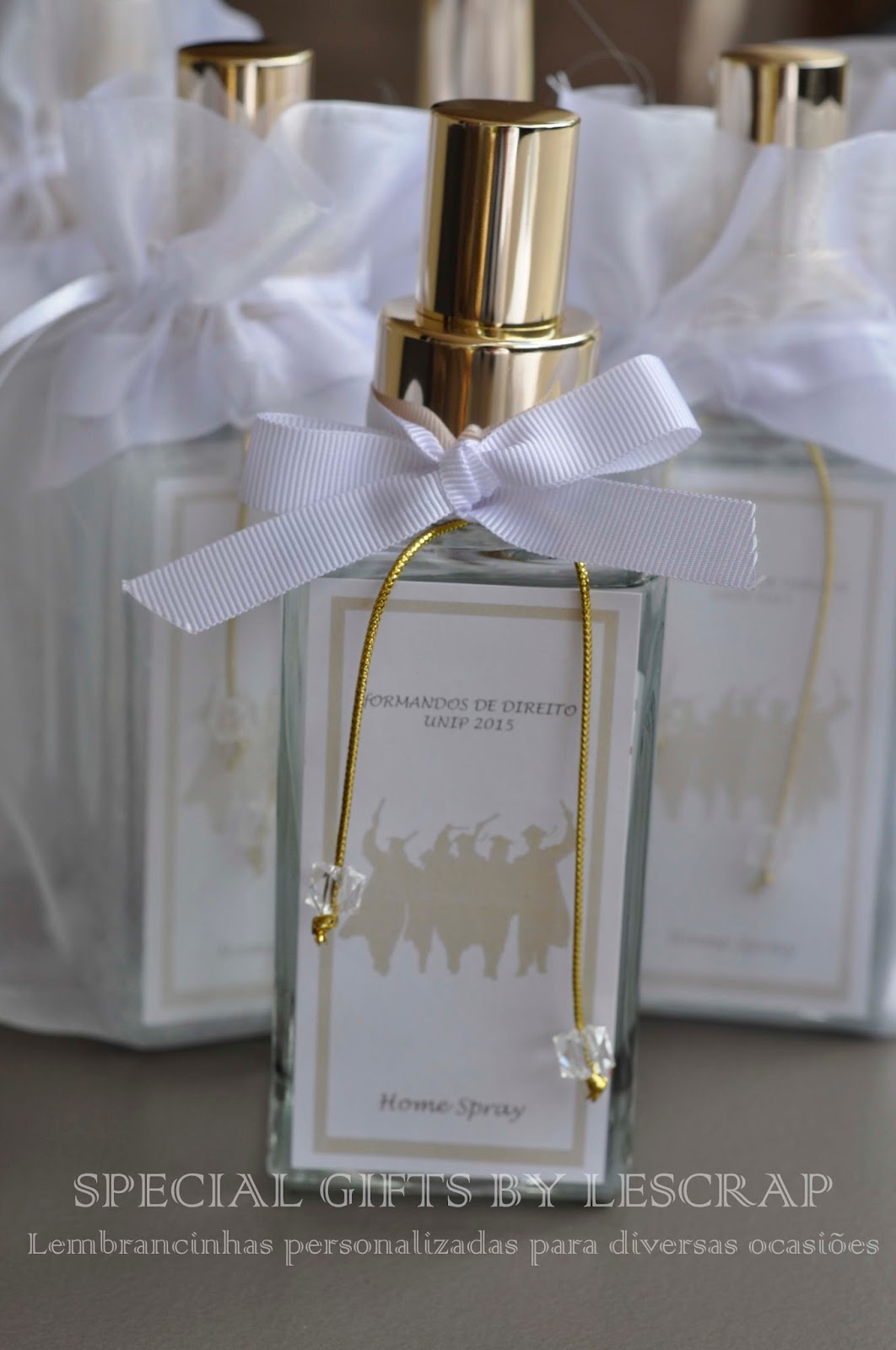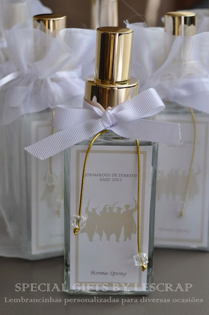 Frasco de home spray modelo quartier de 150ml, rótulo personalizado, fita de gorgurão e saquinho de organza, confeccionado especialmente para a turma de Direito da faculdade UNIP.