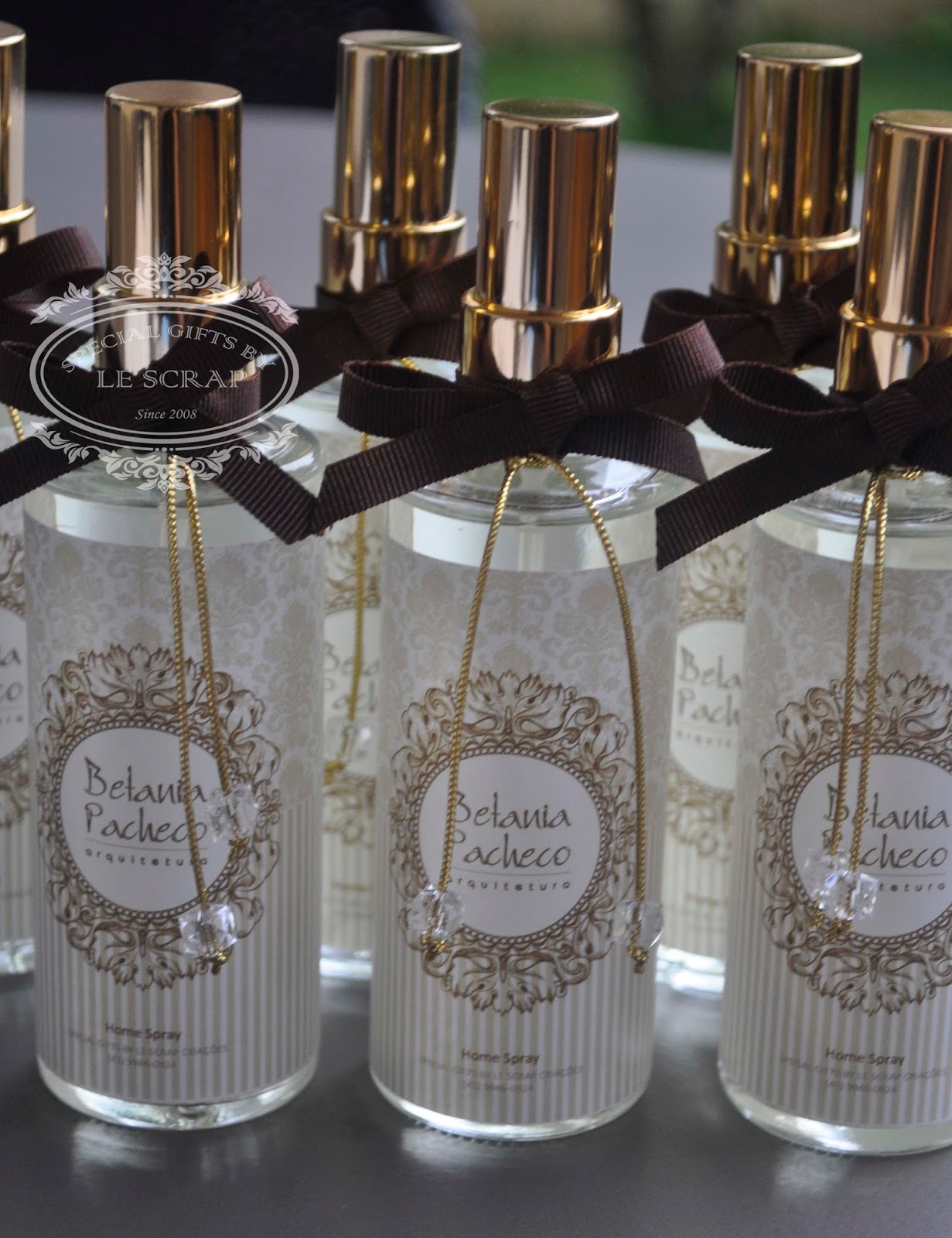 Frasco de home Spray modelo cônico de 120ml com rotulo personalizado, pingente com cristais e fita de gorgorão.