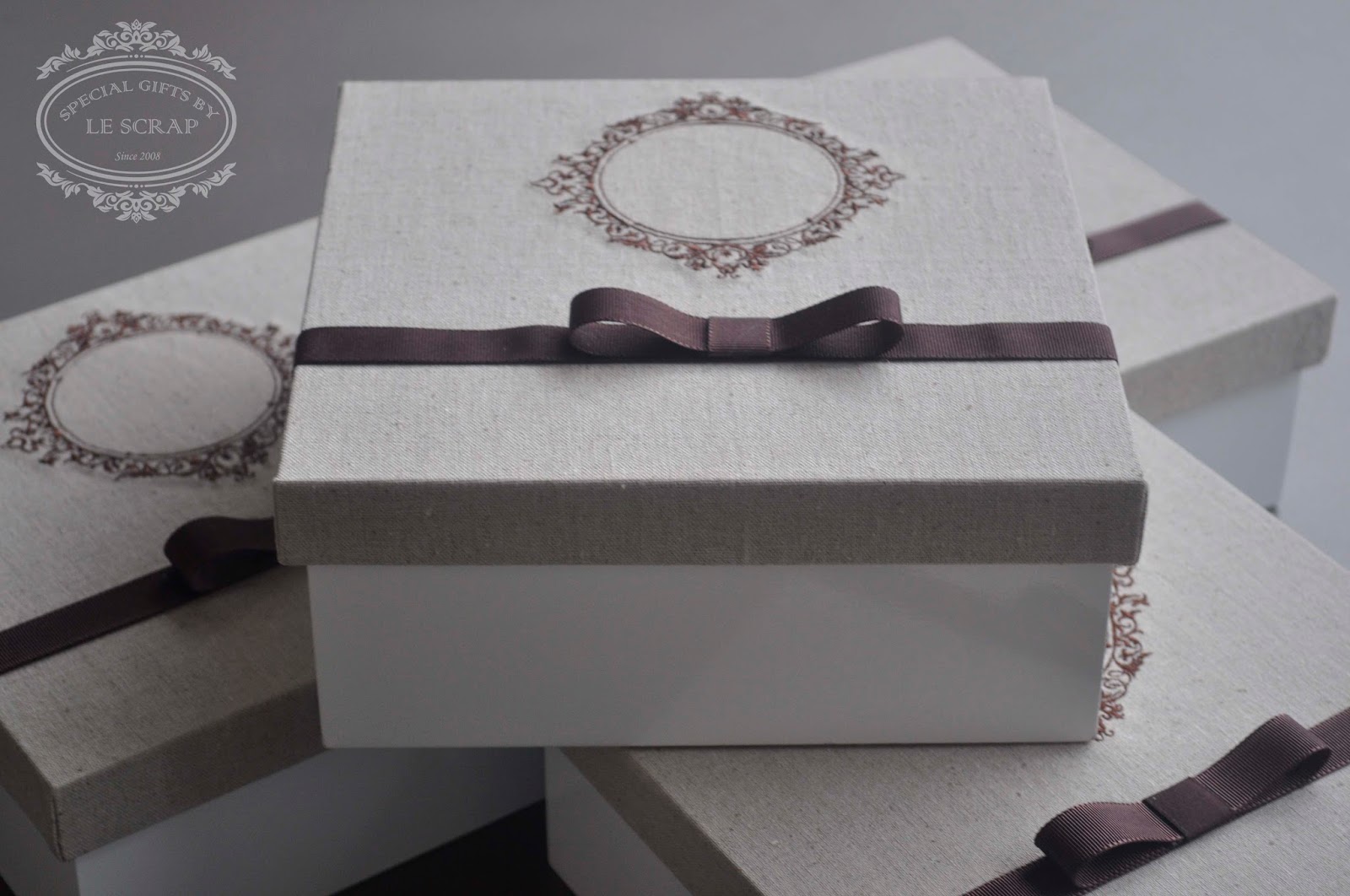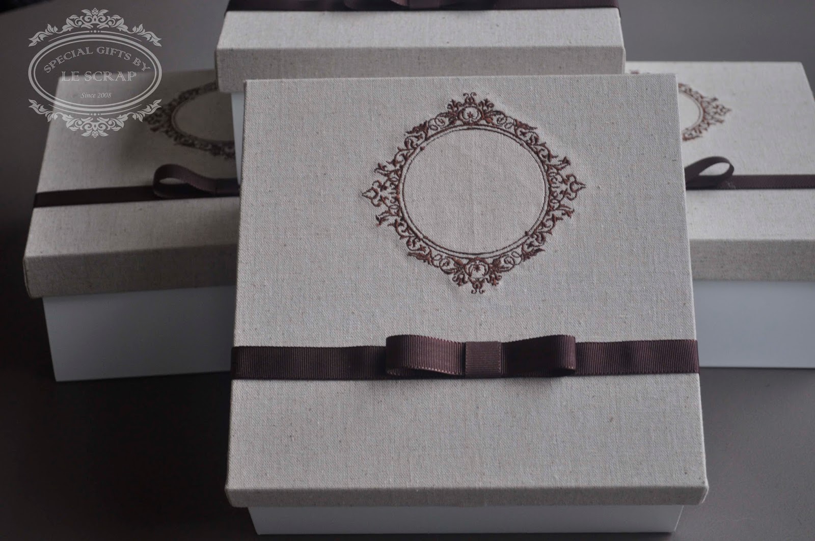 Para presentear seus padrinhos confeccionamos uma caixa com o brasão bordado no tom de marrom, caixa com tampa em linho e base em laca branca.