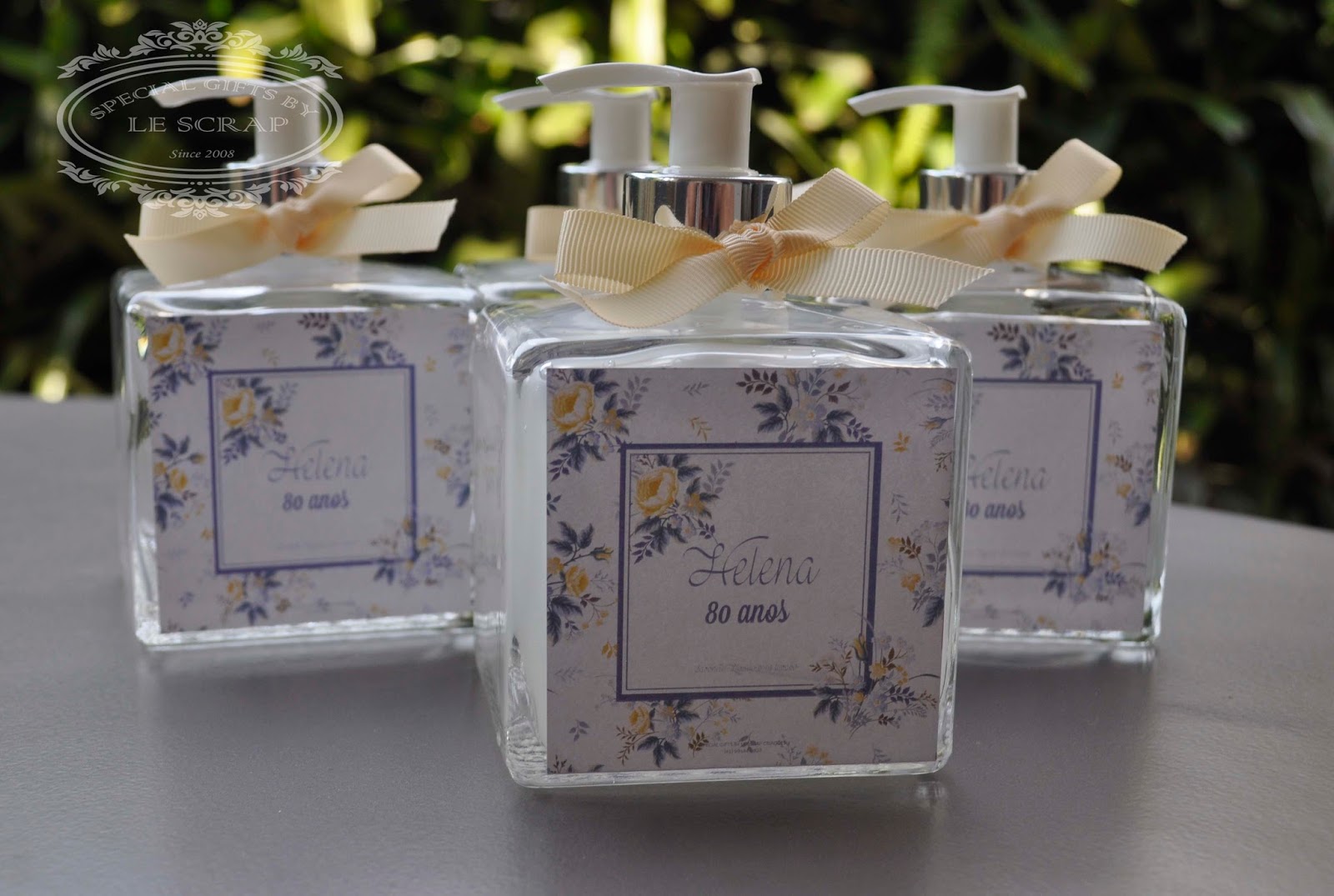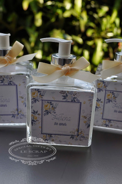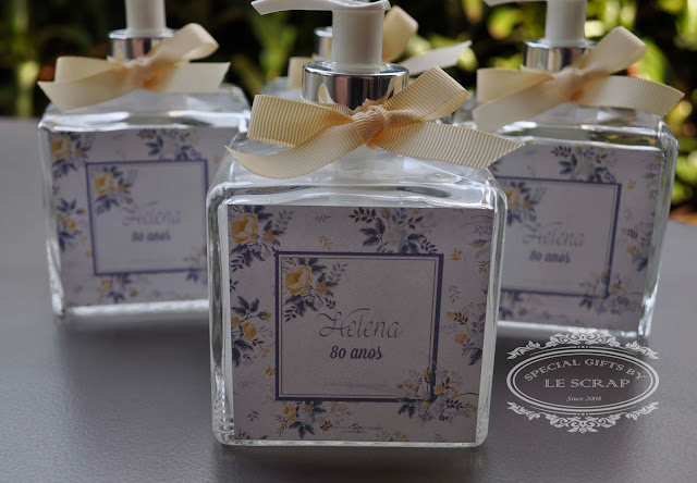 Frasco de sabonete líquido modelo cubo de 350ml confeccionado para o aniversário de 80 anos da D. Helena.