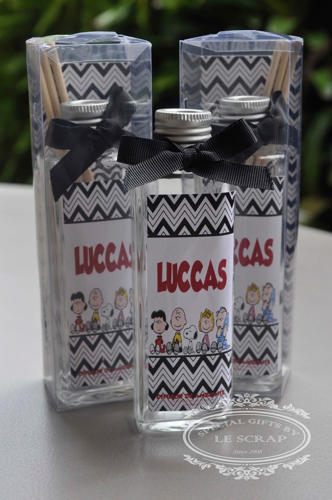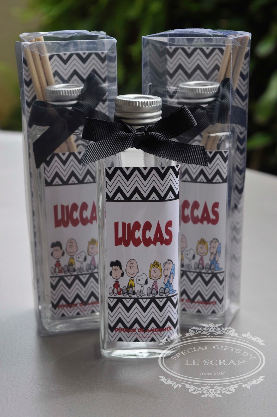 Para o aniversário do Luccas que teve como tema A Turma do Snoop a mamãe escolheu presentear os amigos e familiares com um frasco de difusor de ambiente modelo retangular de 100ml.