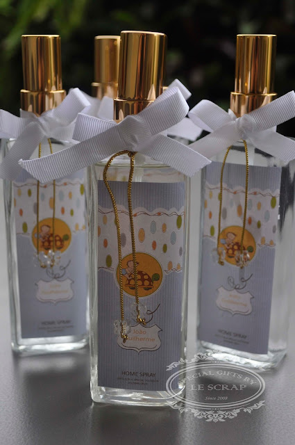 Lembrancinha confeccionada para a chegada do João Guilherme. Como lembrancinha confeccionamos frascos de home spray modelo retangular de 100ml acompanhado de rótulo personalizado, fita de gorgurão e embalagem.