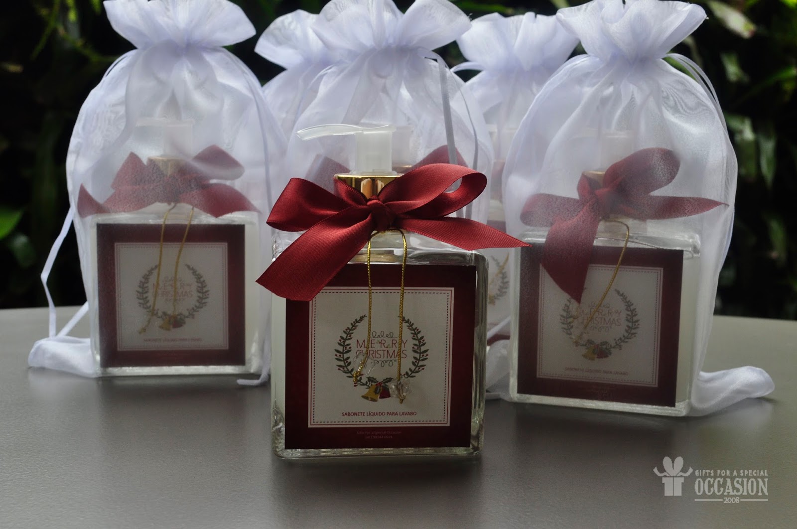 Sabonete líquido modelo cubo de 350ml com rótulo personalizado acompanha saquinho de organza e mensagem com votos de natal.