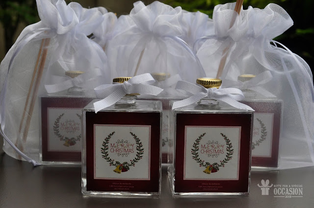 Difusor de ambiente modelo cubo de 100ml com rótulo personalizado acompanha saquinho de organza e mensagem com votos de natal.