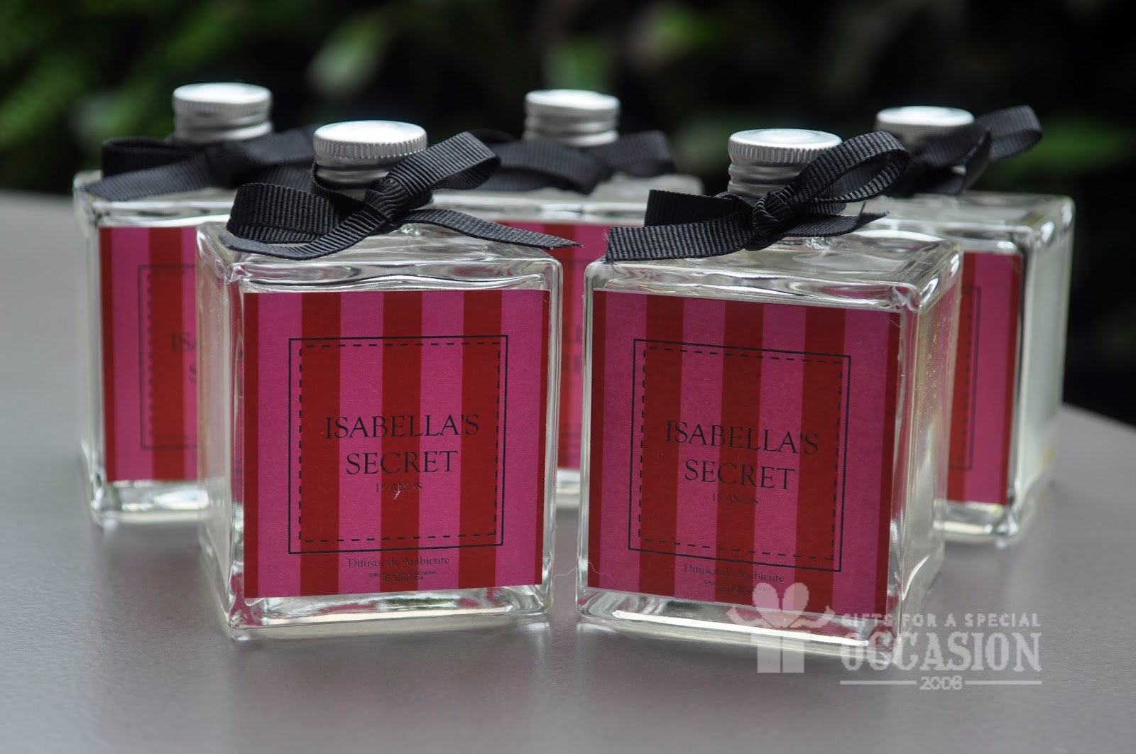 Como lembrancinha confeccionamos frascos de difusor de ambiente modelo cubo de 100ml acompanhado de rótulo personalizado, fita de gorgorão, varetas e embalagem.