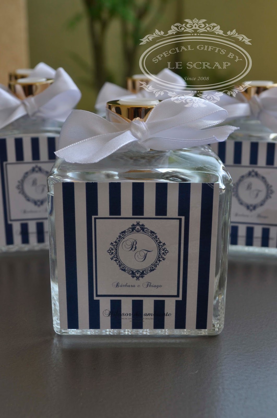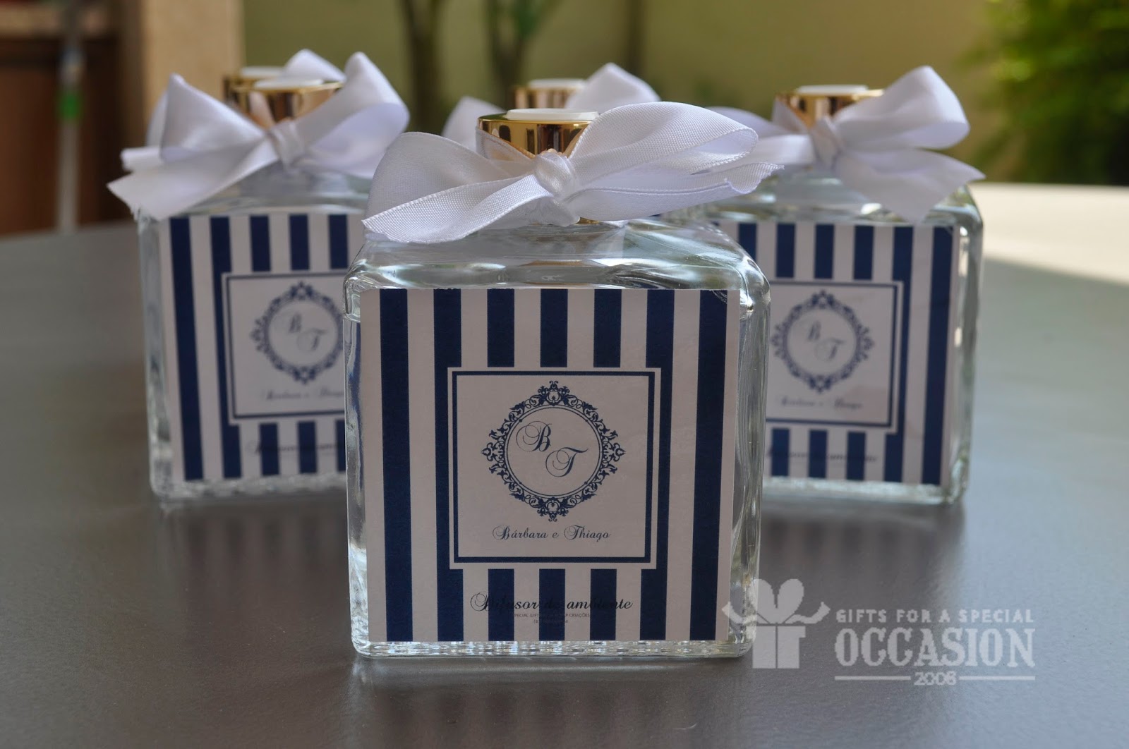 Frasco de difusor de ambiente modelo cubo de 350ml acompanhado de rótulo personalizado, embalagem e fita confeccionado para o casamento da Barbara e do Thiago.