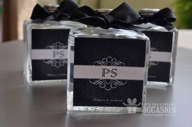 Frasco de difusor de ambiente modelo Cubo de 350ml acompanhado de rótulo personalizado, embalagem personalizada e fita , confeccionado para o casamento da Paula e Sérgio .