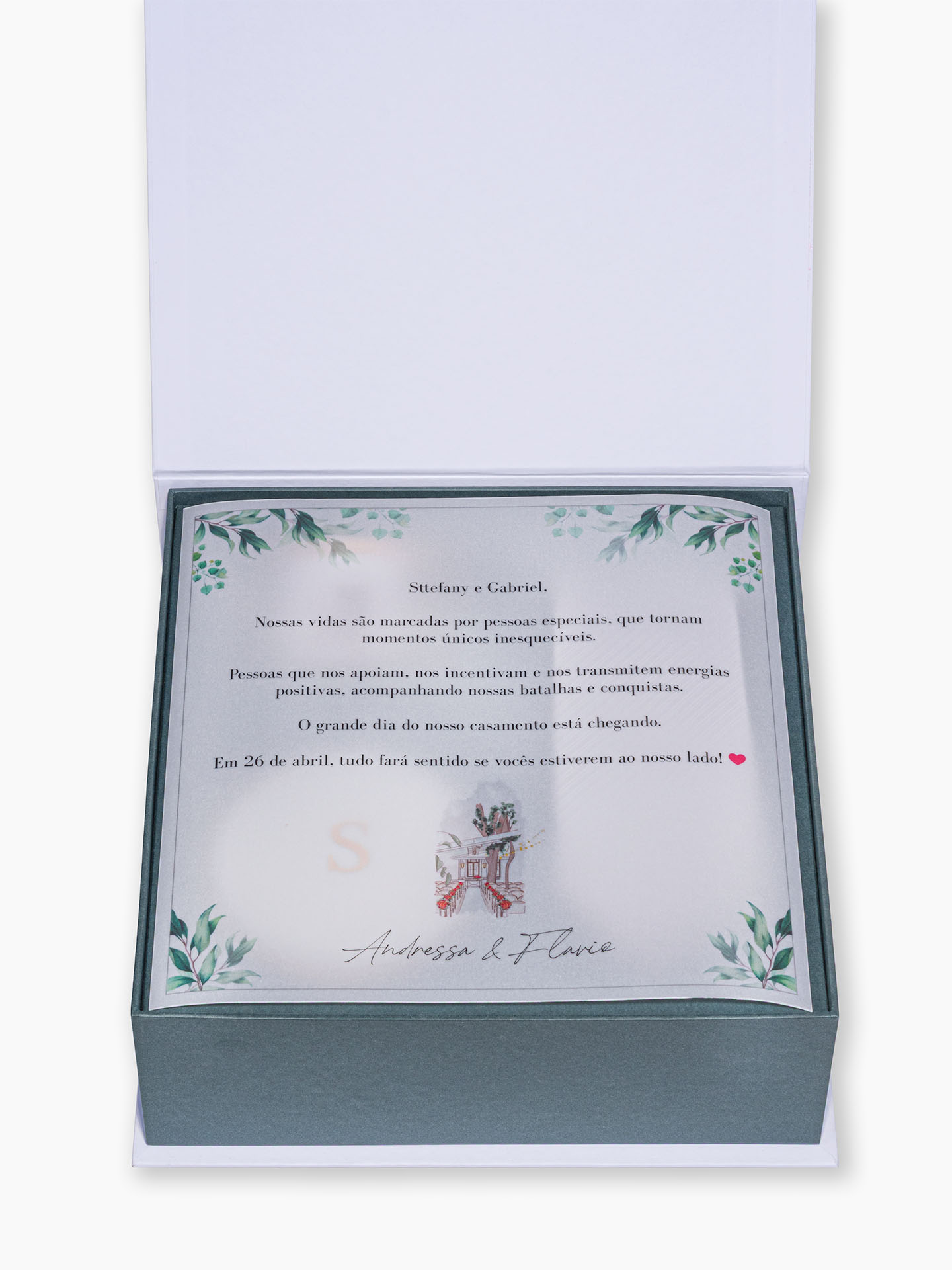 Além disso, o kit acompanha um convite em papel de alta qualidade, podendo ser papel vegetal fosco translúcido, reforçando o caráter emocional do convite.