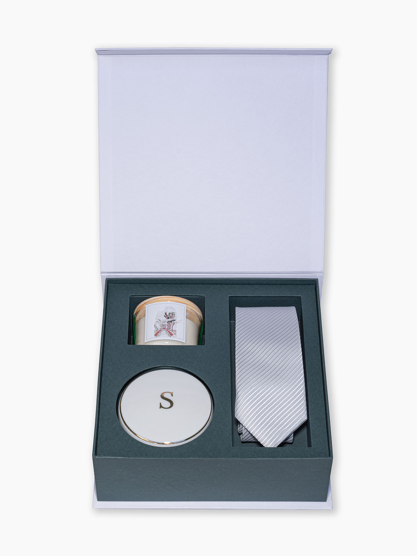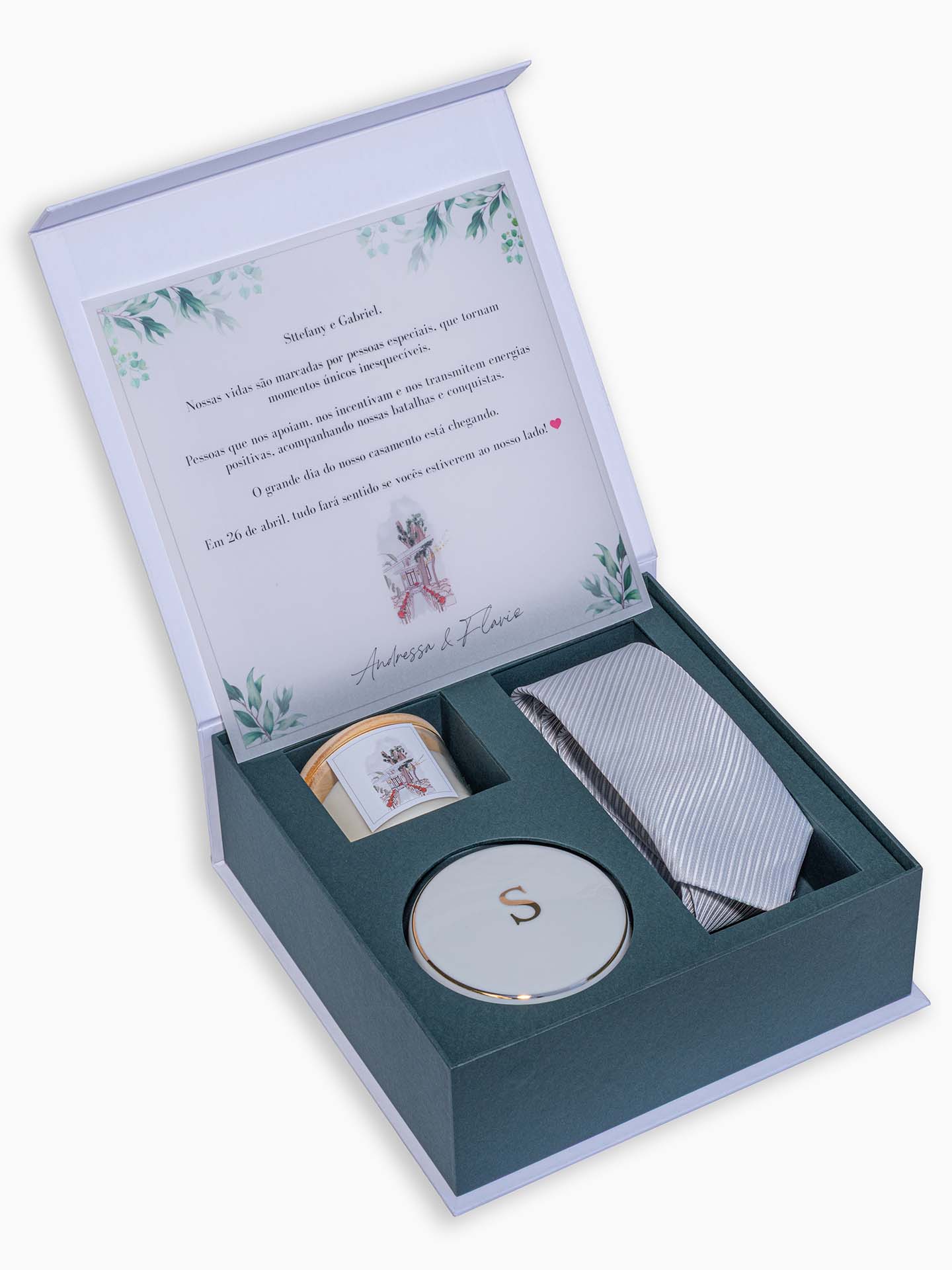 - ou a caixa vazia, montando o kit com itens comprados separadamente no site (vela, gravata, cantil)