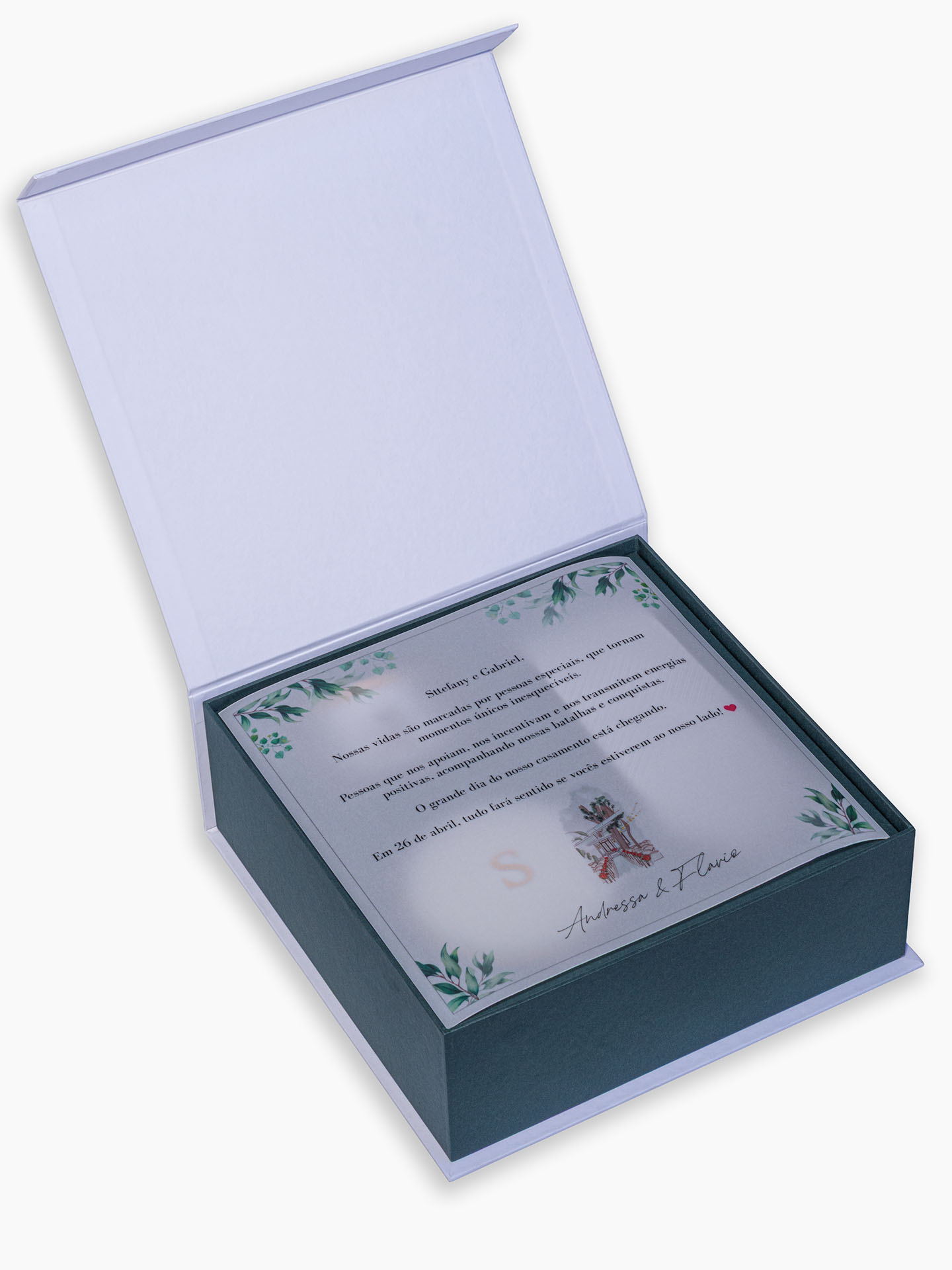 A Caixa Personalizada Célébrer III – Casal foi pensada, antes de tudo, para noivos que desejam convidar seus padrinhos com um presente à altura desse momento único. Por isso, combinamos design sofisticado, personalização total e acabamento artesanal premium, criando um kit que emociona já no primeiro contato.