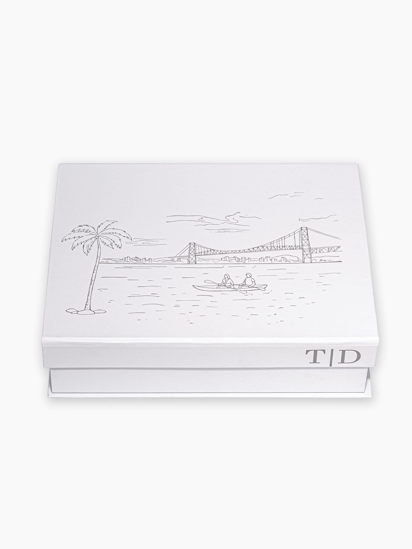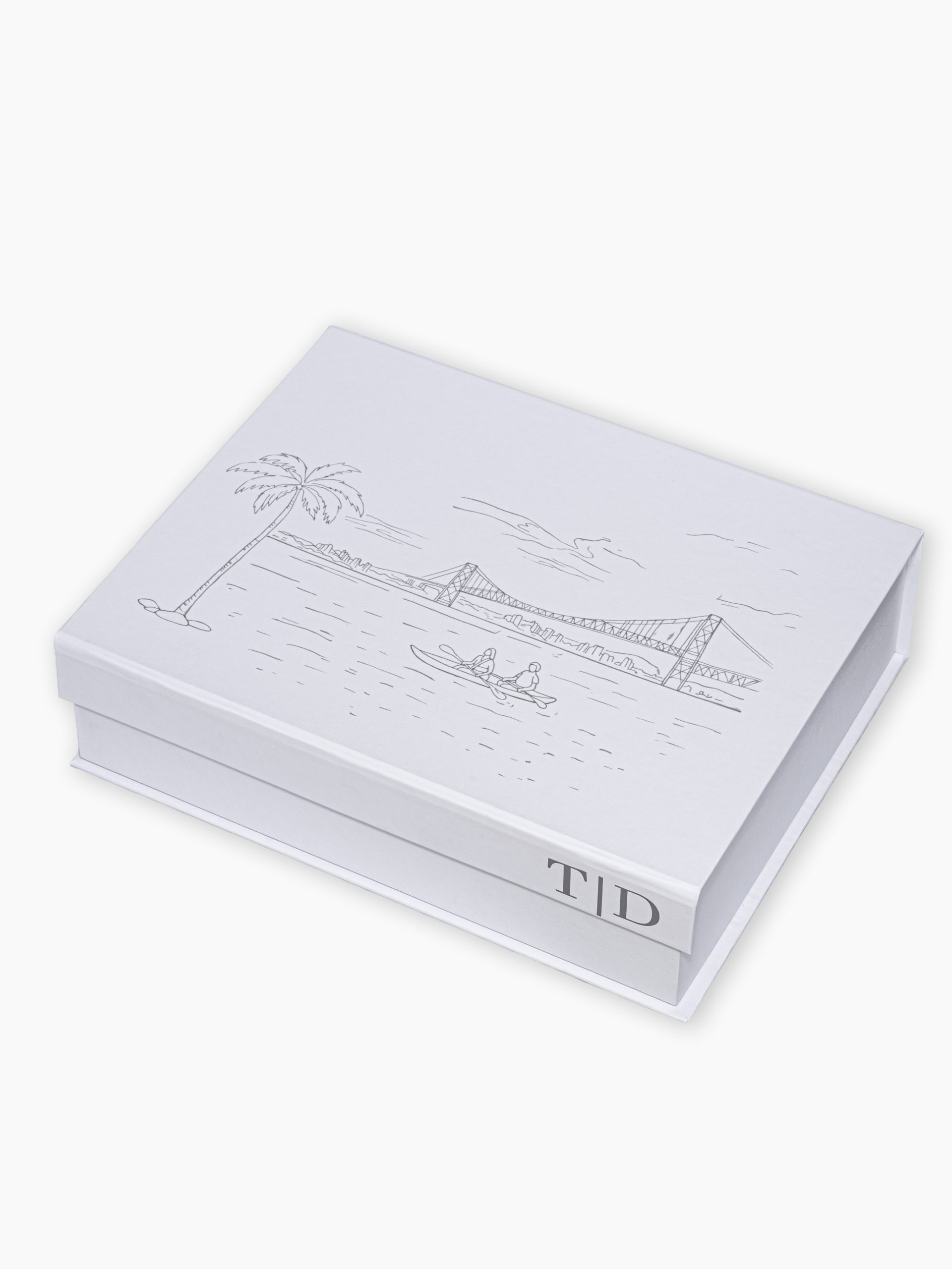 Personalizamos a caixa com as iniciais do casal de padrinhos, que podem ser aplicadas na tampa superior ou na aba frontal. Quando desejado, os noivos podem incluir uma aquarela exclusiva (serviço opcional), que transforma a caixa em uma verdadeira peça artística. Por fim também personalizamos todos os itens do kit (cor da necessaire, da gravata, do bordado, arte do convite, etc…)