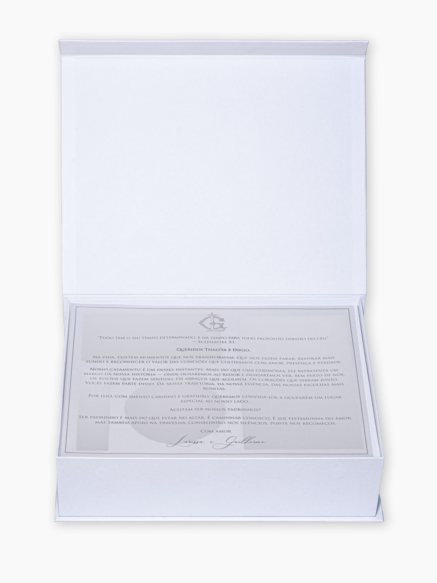 Por fim a caixa acompanha convite personalizado em papel de alta qualidade podendo ser papel vegetal fosco translúcido. Ele reforça a delicadeza, o cuidado artesanal e o posicionamento premium da marca.