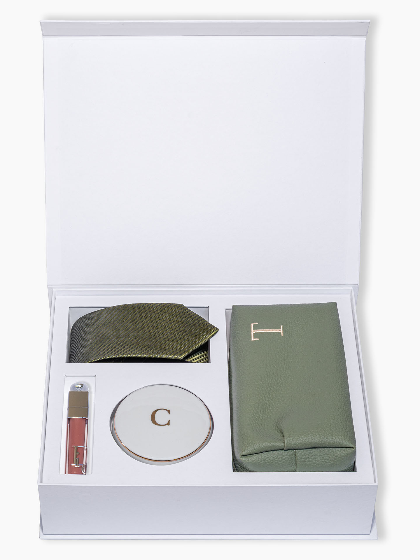 - Para a madrinha: Porta-joias em porcelana branca de alta qualidade com inicial na tampa e filete em ouro ou platina importada. Além disso, reservamos um espaço interno para gloss (não incluso), permitindo liberdade total de escolha por parte da noiva.