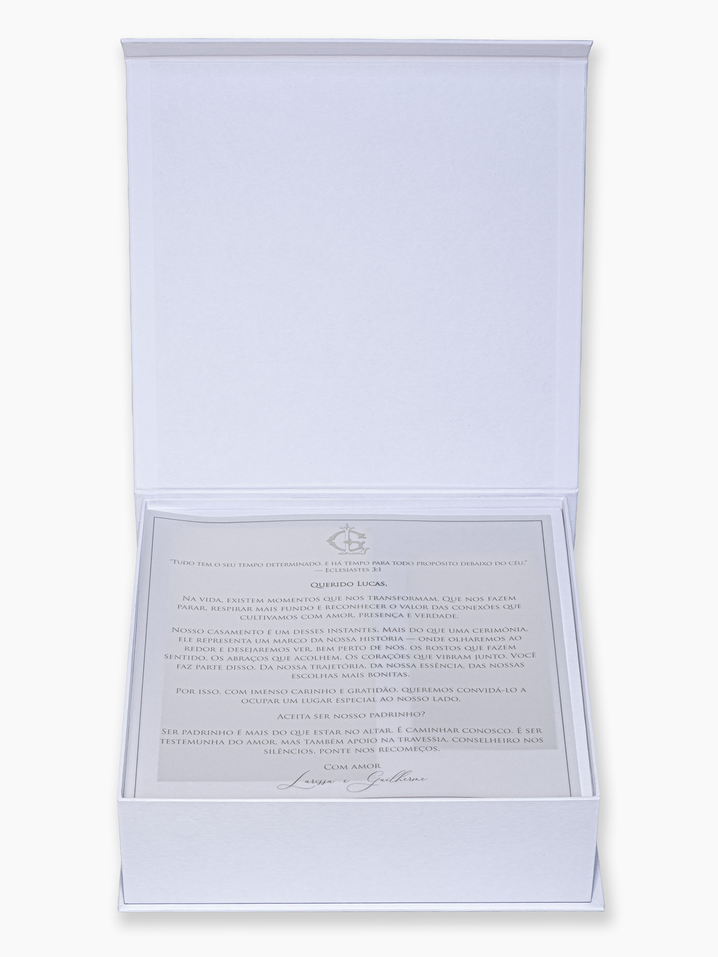 Para complementar, incluímos um convite personalizado em papel de alta gramatura que pode ser papel vegetal fosco translúcido, que adiciona leveza, sofisticação e coerência visual ao conjunto.