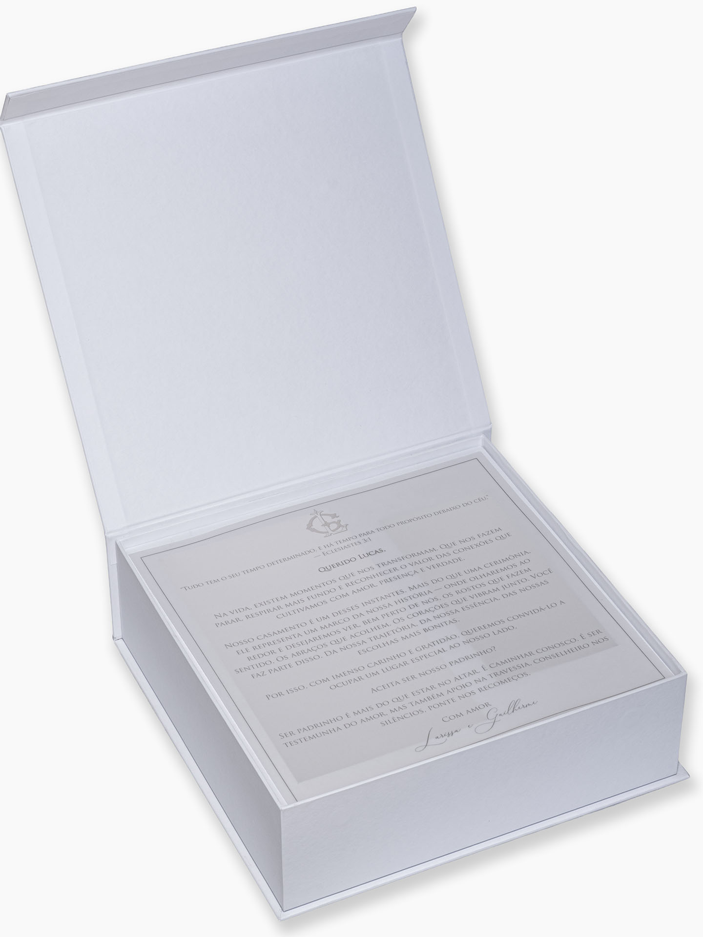 Personalizamos a caixa com a inicial do padrinho, aplicada na tampa superior ou na aba frontal caso tiver uma aquarela na tampa. Além disso, o cliente pode escolher cores do papel e, cor do couro ecológico; cor do bordado e cor e modelo da gravata. Você também pode se desejar, incluir uma aquarela artística (não inclusa no valor).