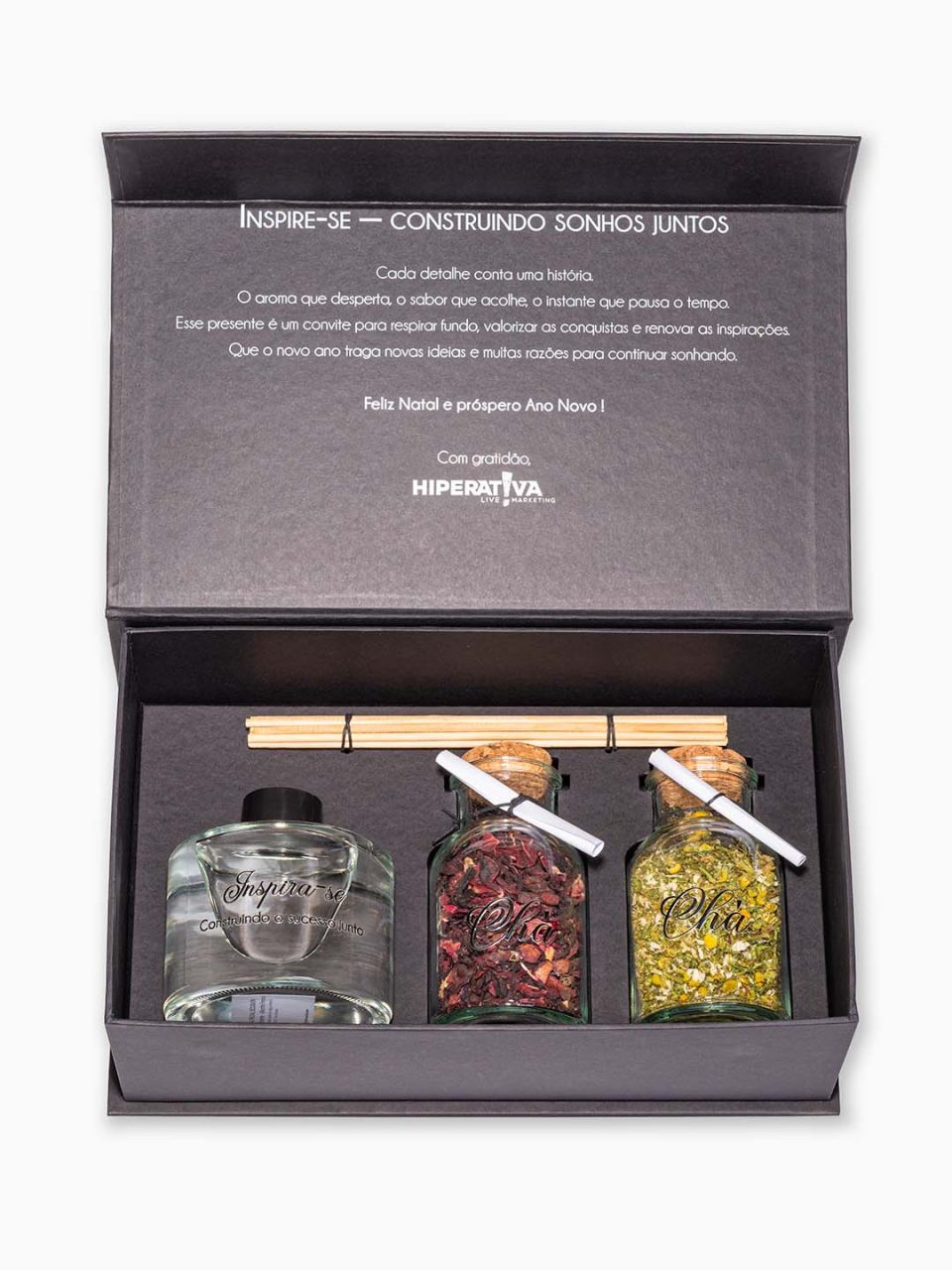 No interior da caixa, pensamos o conjunto para proporcionar uma experiência completa de pausa e bem-estar. O difusor de ambiente em vidro perfuma o espaço de forma delicada e contínua, enquanto os dois vidros com tampa de rolha — um com chá de camomila e outro com chá de hibisco — convidam a um momento de acolhimento e tranquilidade. Assim, aroma, sabor e mensagem se complementam de maneira harmônica.