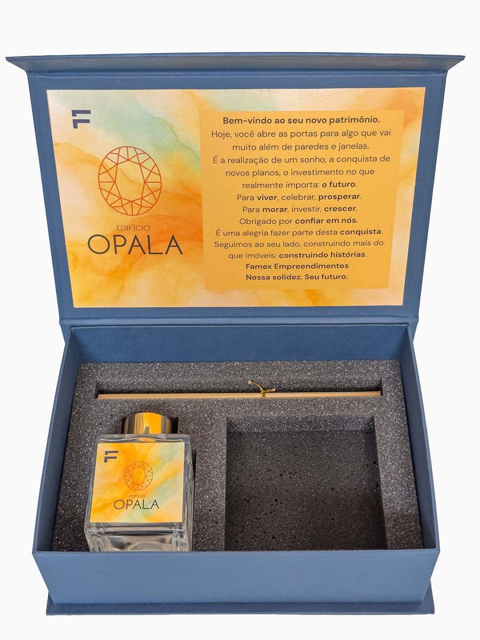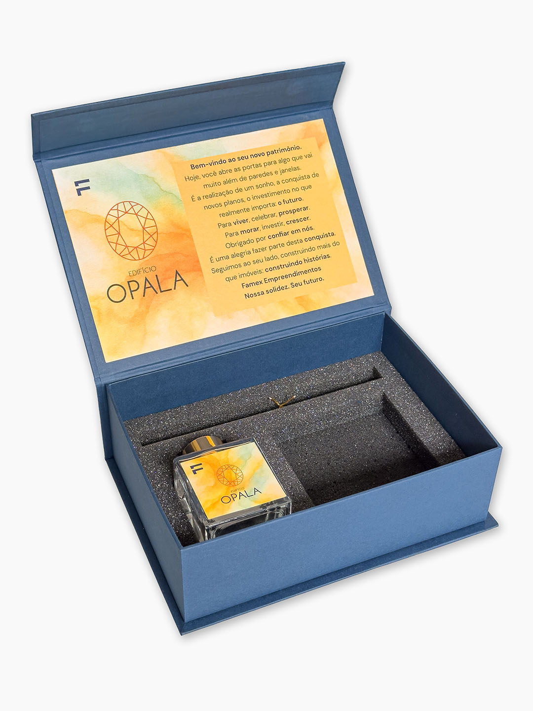 Inicialmente, a caixa cartonada modelo livro se destaca pelo acabamento premium e pela arte personalizada na tampa. Em seguida, ao abrir, o morador encontra uma mensagem interna impressa, reforçando o sentimento de pertencimento e acolhimento.