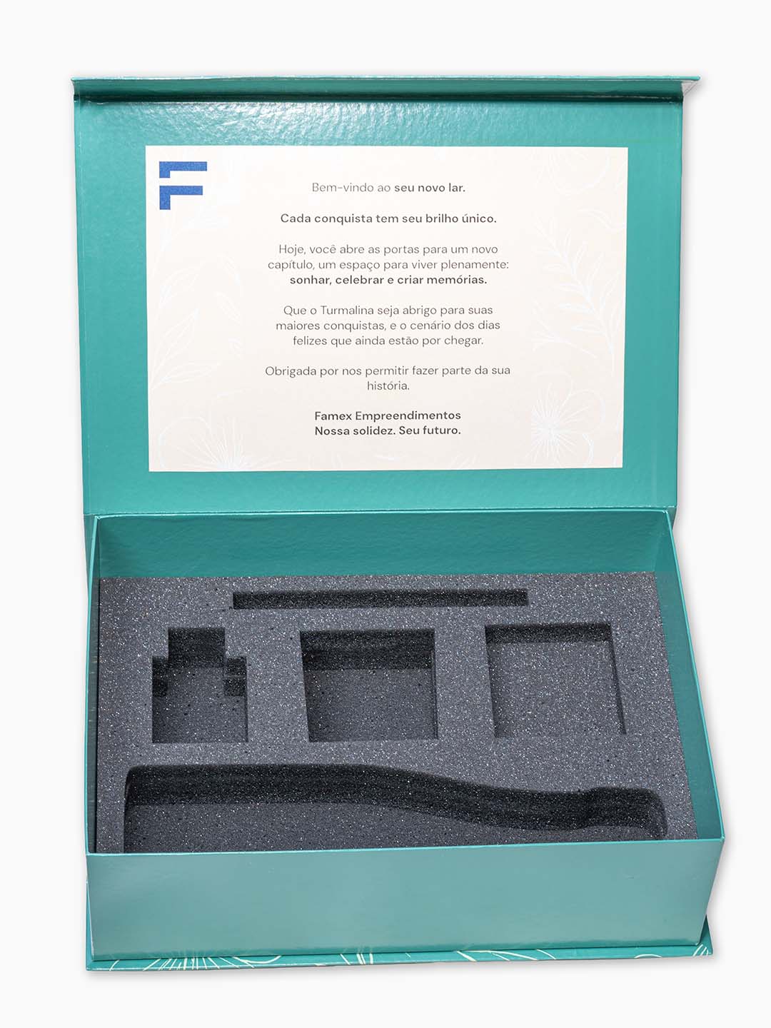 Primeiramente, a caixa cartonada modelo livro, com fechamento magnético, impressiona pelo acabamento premium e pela arte personalizada na tampa. Em seguida, ao ser aberta, revela uma mensagem interna impressa, criando uma conexão emocional imediata com o novo morador. Dessa forma, a experiência deixa de ser apenas funcional e passa a ser memorável.