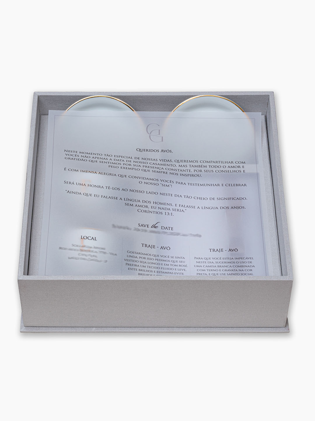 A caixa é confeccionada artesanalmente em MDF com forração em linho de alta qualidade, e uma tampa de acrílico gravada a laser com as iniciais do casal. Além disso, um berço sob medida acomoda com perfeição os itens: