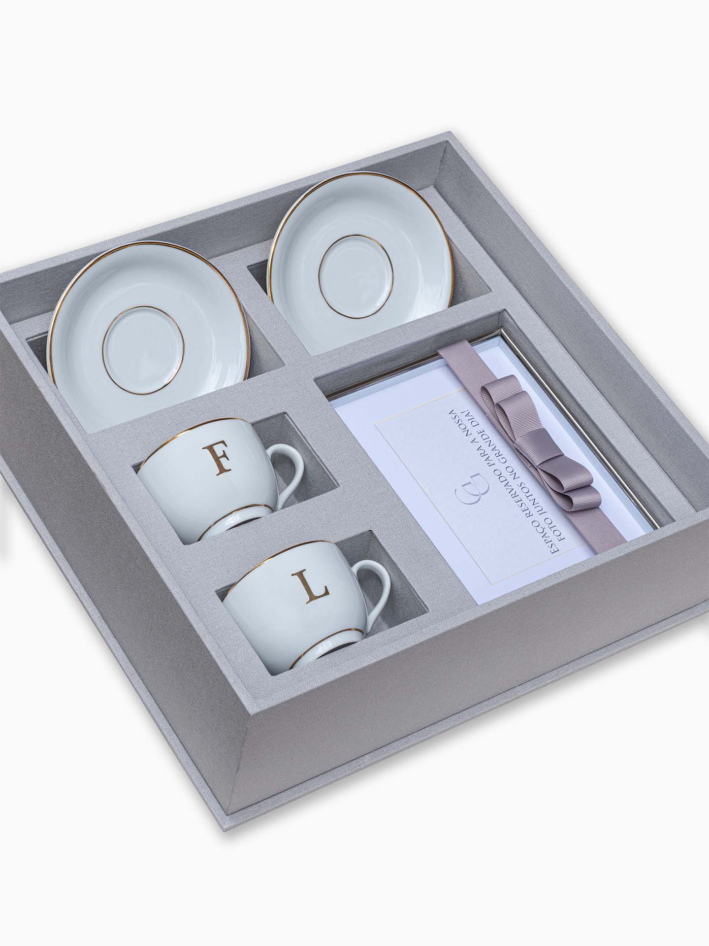 - 2 xícaras de chá com pires em porcelana branca, personalizadas com iniciais e filete de ouro ou platina